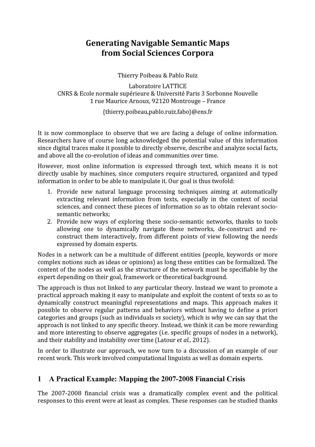 It is now commonplace to observe that we are facing a deluge of online information. Researchers have of course long acknowledged the potential value of this information since digital traces make it possible to directly observe, describe and analyze social facts, and above all the co-evolution of ideas and communities over time. However, most online information is expressed through text, which means it is not directly usable by machines, since computers require structured, organized and typed information in order to be able to manipulate it. Our goal is thus twofold: 1. Provide new natural language processing techniques aiming at automatically extracting relevant information from texts, especially in the context of social sciences, and connect these pieces of information so as to obtain relevant socio-semantic networks; 2. Provide new ways of exploring these socio-semantic networks, thanks to tools allowing one to dynamically navigate these networks, de-construct and re-construct them interactively, from different points of view following the needs expressed by domain experts.