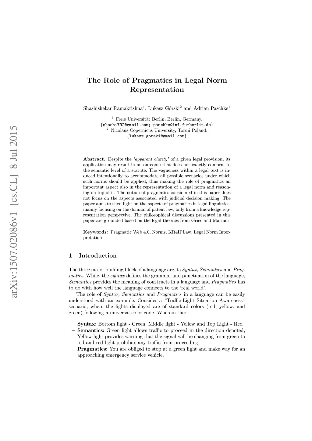 Despite the ápparent clarity' of a given legal provision, its application may result in an outcome that does not exactly conform to the semantic level of a statute. The vagueness within a legal text is induced intentionally to accommodate all possible scenarios under which such norms should be applied, thus making the role of pragmatics an important aspect also in the representation of a legal norm and reasoning on top of it. The notion of pragmatics considered in this paper does not focus on the aspects associated with judicial decision making. The paper aims to shed light on the aspects of pragmatics in legal linguistics, mainly focusing on the domain of patent law, only from a knowledge representation perspective. The philosophical discussions presented in this paper are grounded based on the legal theories from Grice and Marmor.