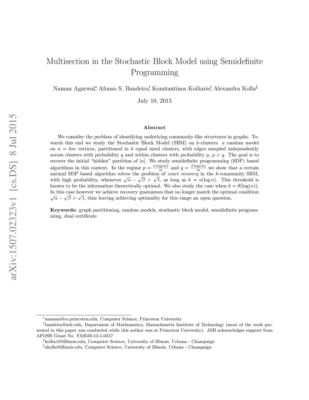 We consider the problem of identifying underlying community-like structures in graphs. Towards this end we study the Stochastic Block Model (SBM) on -clusters: a random model on vertices, partitioned in equal sized clusters, with edges sampled independently across clusters with probability and within clusters with probability , . The goal is to recover the initial "hidden" partition of . We study semidefinite programming (SDP) based algorithms in this context. In the regime and we show that a certain natural SDP based algorithm solves the problem of {\em exact recovery} in the -community SBM, with high probability, whenever , as long as . This threshold is known to be the information theoretically optimal. We also study the case when . In this case however we achieve recovery guarantees that no longer match the optimal condition , thus leaving achieving optimality for this range an open question.
