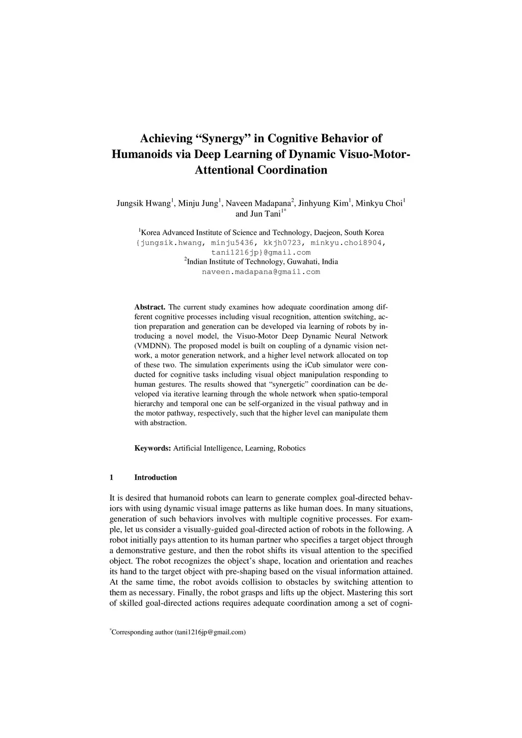 The current study examines how adequate coordination among different cognitive processes including visual recognition, attention switching, action preparation and generation can be developed via learning of robots by introducing a novel model, the Visuo-Motor Deep Dynamic Neural Network (VMDNN). The proposed model is built on coupling of a dynamic vision network, a motor generation network, and a higher level network allocated on top of these two. The simulation experiments using the iCub simulator were conducted for cognitive tasks including visual object manipulation responding to human gestures. The results showed that synergetic coordination can be developed via iterative learning through the whole network when spatio-temporal hierarchy and temporal one can be self-organized in the visual pathway and in the motor pathway, respectively, such that the higher level can manipulate them with abstraction.