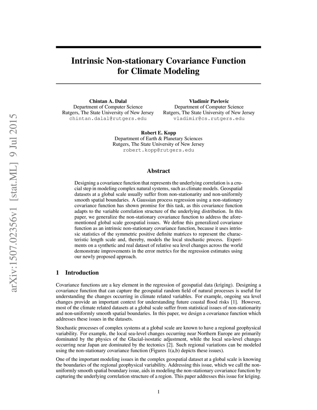 Intrinsic Non-stationary Covariance Function for Climate Modeling