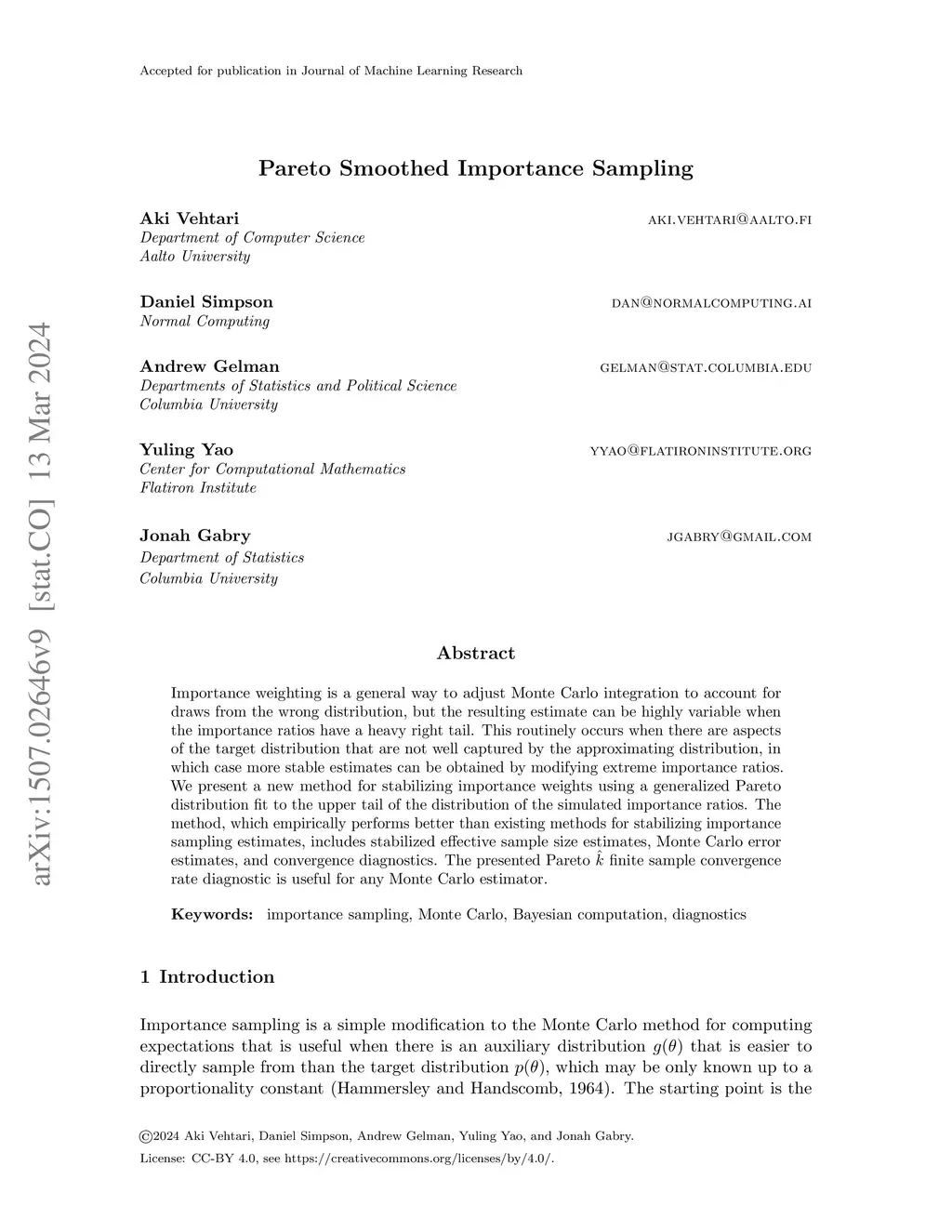 Importance weighting is a general way to adjust Monte Carlo integration to account for draws from the wrong distribution, but the resulting estimate can be highly variable when the importance ratios have a heavy right tail. This routinely occurs when there are aspects of the target distribution that are not well captured by the approximating distribution, in which case more stable estimates can be obtained by modifying extreme importance ratios. We present a new method for stabilizing importance weights using a generalized Pareto distribution fit to the upper tail of the distribution of the simulated importance ratios. The method, which empirically performs better than existing methods for stabilizing importance sampling estimates, includes stabilized effective sample size estimates, Monte Carlo error estimates, and convergence diagnostics. The presented Pareto finite sample convergence rate diagnostic is useful for any Monte Carlo estimator.