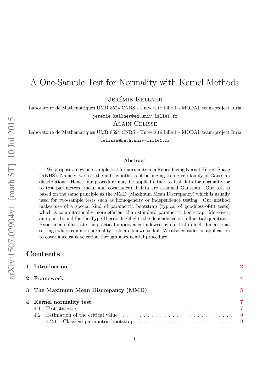 We propose a new one-sample test for normality in a Reproducing Kernel Hilbert Space (RKHS). Namely, we test the null-hypothesis of belonging to a given family of Gaussian distributions. Hence our procedure may be applied either to test data for normality or to test parameters (mean and covariance) if data are assumed Gaussian. Our test is based on the same principle as the MMD (Maximum Mean Discrepancy) which is usually used for two-sample tests such as homogeneity or independence testing. Our method makes use of a special kind of parametric bootstrap (typical of goodness-of-fit tests) which is computationally more efficient than standard parametric bootstrap. Moreover, an upper bound for the Type-II error highlights the dependence on influential quantities. Experiments illustrate the practical improvement allowed by our test in high-dimensional settings where common normality tests are known to fail. We also consider an application to covariance rank selection through a sequential procedure.