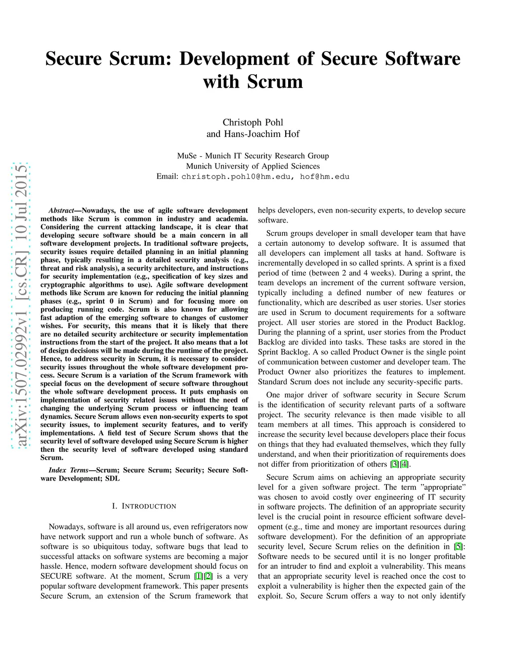 Nowadays, the use of agile software development methods like Scrum is common in industry and academia. Considering the current attacking landscape, it is clear that developing secure software should be a main concern in all software development projects. In traditional software projects, security issues require detailed planning in an initial planning phase, typically resulting in a detailed security analysis (e.g., threat and risk analysis), a security architecture, and instructions for security implementation (e.g., specification of key sizes and cryptographic algorithms to use). Agile software development methods like Scrum are known for reducing the initial planning phases (e.g., sprint 0 in Scrum) and for focusing more on producing running code. Scrum is also known for allowing fast adaption of the emerging software to changes of customer wishes. For security, this means that it is likely that there are no detailed security architecture or security implementation instructions from the start of the project. It also means that a lot of design decisions will be made during the runtime of the project. Hence, to address security in Scrum, it is necessary to consider security issues throughout the whole software development process. Secure Scrum is a variation of the Scrum framework with special focus on the development of secure software throughout the whole software development process. It puts emphasis on implementation of security related issues without the need of changing the underlying Scrum process or influencing team dynamics. Secure Scrum allows even non- security experts to spot security issues, to implement security features, and to verify implementations. A field test of Secure Scrum shows that the security level of software developed using Secure Scrum is higher then the security level of software developed using standard Scrum.