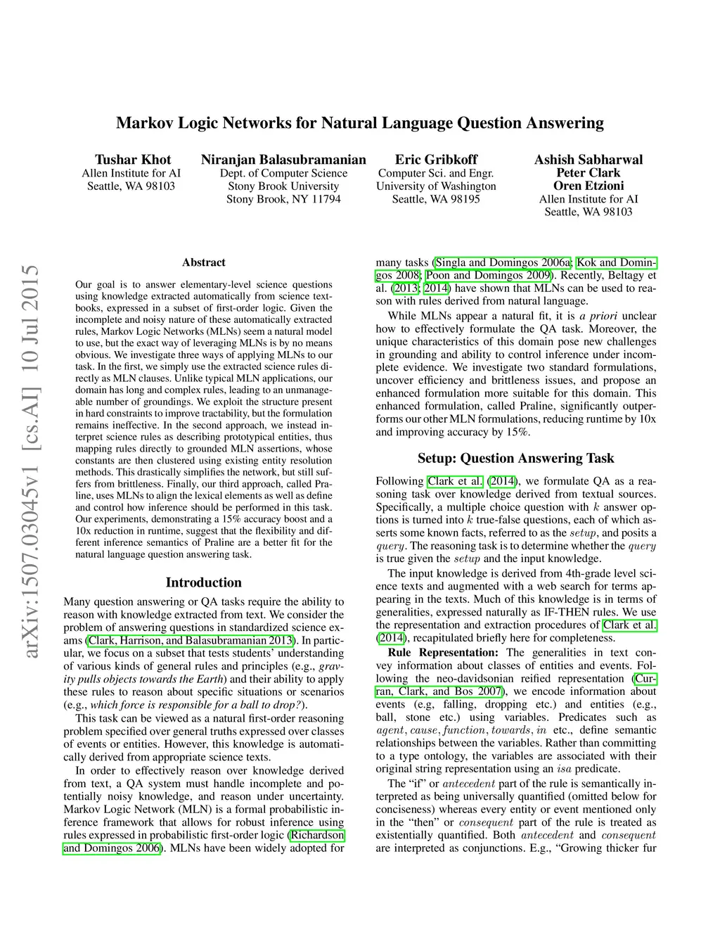 Our goal is to answer elementary-level science questions using knowledge extracted automatically from science textbooks, expressed in a subset of first-order logic. Given the incomplete and noisy nature of these automatically extracted rules, Markov Logic Networks (MLNs) seem a natural model to use, but the exact way of leveraging MLNs is by no means obvious. We investigate three ways of applying MLNs to our task. In the first, we simply use the extracted science rules directly as MLN clauses. Unlike typical MLN applications, our domain has long and complex rules, leading to an unmanageable number of groundings. We exploit the structure present in hard constraints to improve tractability, but the formulation remains ineffective. In the second approach, we instead interpret science rules as describing prototypical entities, thus mapping rules directly to grounded MLN assertions, whose constants are then clustered using existing entity resolution methods. This drastically simplifies the network, but still suffers from brittleness. Finally, our third approach, called Praline, uses MLNs to align the lexical elements as well as define and control how inference should be performed in this task. Our experiments, demonstrating a 15\% accuracy boost and a 10x reduction in runtime, suggest that the flexibility and different inference semantics of Praline are a better fit for the natural language question answering task.