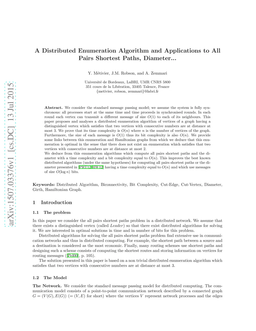 We consider the standard message passing model; we assume the system is fully synchronous: all processes start at the same time and time proceeds in synchronised rounds. In each round each vertex can transmit a different message of size to each of its neighbours. This paper proposes and analyses a distributed enumeration algorithm of vertices of a graph having a distinguished vertex which satisfies that two vertices with consecutive numbers are at distance at most . We prove that its time complexity is where is the number of vertices of the graph. Furthermore, the size of each message is thus its bit complexity is also We provide some links between this enumeration and Hamiltonian graphs from which we deduce that this enumeration is optimal in the sense that there does not exist an enumeration which satisfies that two vertices with consecutive numbers are at distance at most . We deduce from this enumeration algorithms which compute all pairs shortest paths and the diameter with a time complexity and a bit complexity equal to . This improves the best known distributed algorithms (under the same hypotheses) for computing all pairs shortest paths or the diameter presented in \cite{PRT12,HW12} having a time complexity equal to and which use messages of size bits.