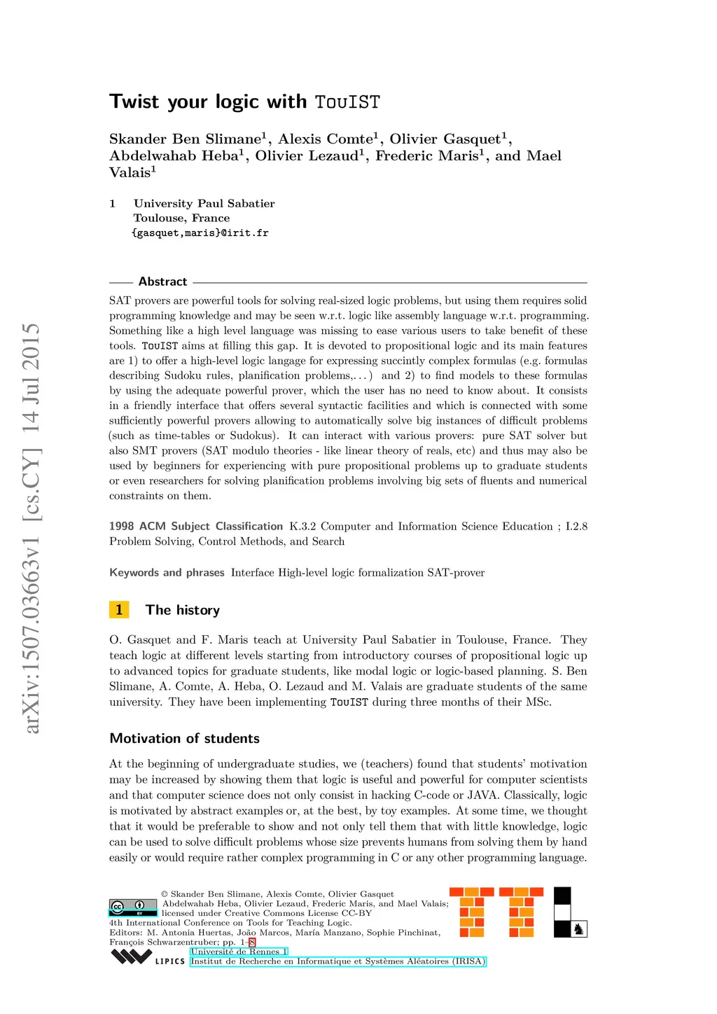SAT provers are powerful tools for solving real-sized logic problems, but using them requires solid programming knowledge and may be seen w.r.t.\ logic like assembly language w.r.t.\ programming. Something like a high level language was missing to ease various users to take benefit of these tools. {\sc \texttt {TouIST}}\ aims at filling this gap. It is devoted to propositional logic and its main features are 1) to offer a high-level logic langage for expressing succintly complex formulas (e.g.\ formulas describing Sudoku rules, planification problems,\ldots) and 2) to find models to these formulas by using the adequate powerful prover, which the user has no need to know about. It consists in a friendly interface that offers several syntactic facilities and which is connected with some sufficiently powerful provers allowing to automatically solve big instances of difficult problems (such as time-tables or Sudokus). It can interact with various provers: pure SAT solver but also SMT provers (SAT modulo theories - like linear theory of reals, etc) and thus may also be used by beginners for experiencing with pure propositional problems up to graduate students or even researchers for solving planification problems involving big sets of fluents and numerical constraints on them.