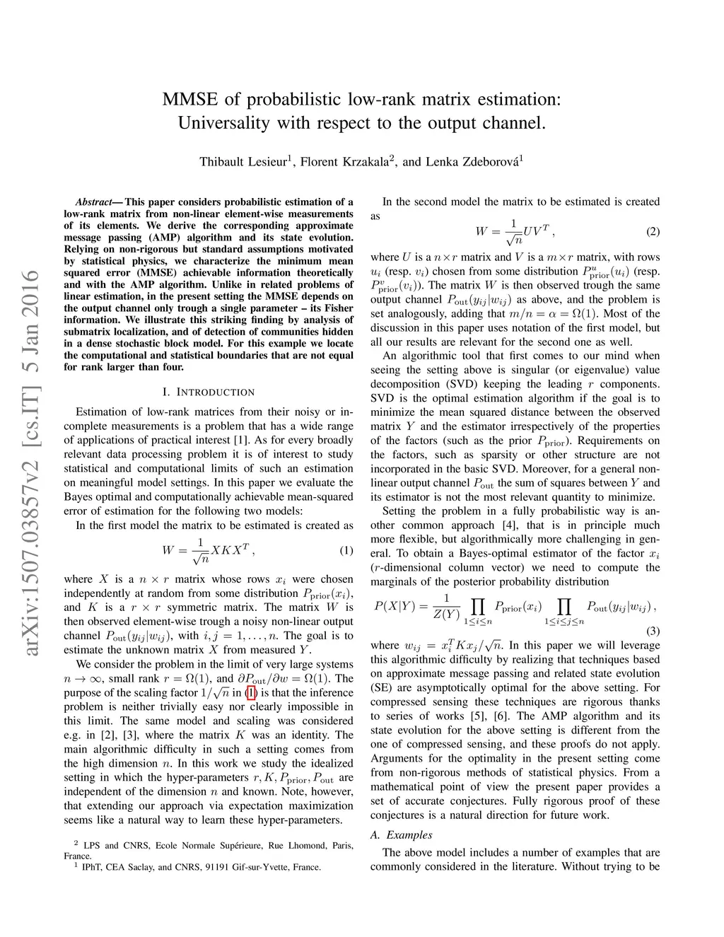 This paper considers probabilistic estimation of a low-rank matrix from non-linear element-wise measurements of its elements. We derive the corresponding approximate message passing (AMP) algorithm and its state evolution. Relying on non-rigorous but standard assumptions motivated by statistical physics, we characterize the minimum mean squared error (MMSE) achievable information theoretically and with the AMP algorithm. Unlike in related problems of linear estimation, in the present setting the MMSE depends on the output channel only trough a single parameter - its Fisher information. We illustrate this striking finding by analysis of submatrix localization, and of detection of communities hidden in a dense stochastic block model. For this example we locate the computational and statistical boundaries that are not equal for rank larger than four.