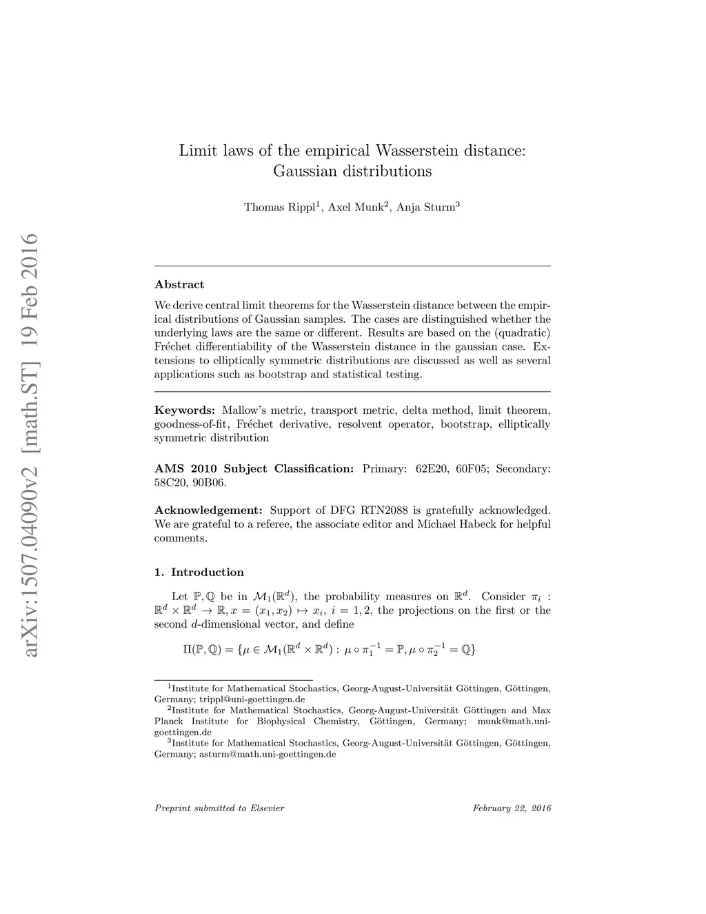 We derive central limit theorems for the Wasserstein distance between the empirical distributions of Gaussian samples. The cases are distinguished whether the underlying laws are the same or different. Results are based on the (quadratic) Frechet differentiability of the Wasserstein distance in the Gaussian case. Extensions to elliptically symmetric distributions are discussed as well as several applications such as bootstrap and statistical testing.