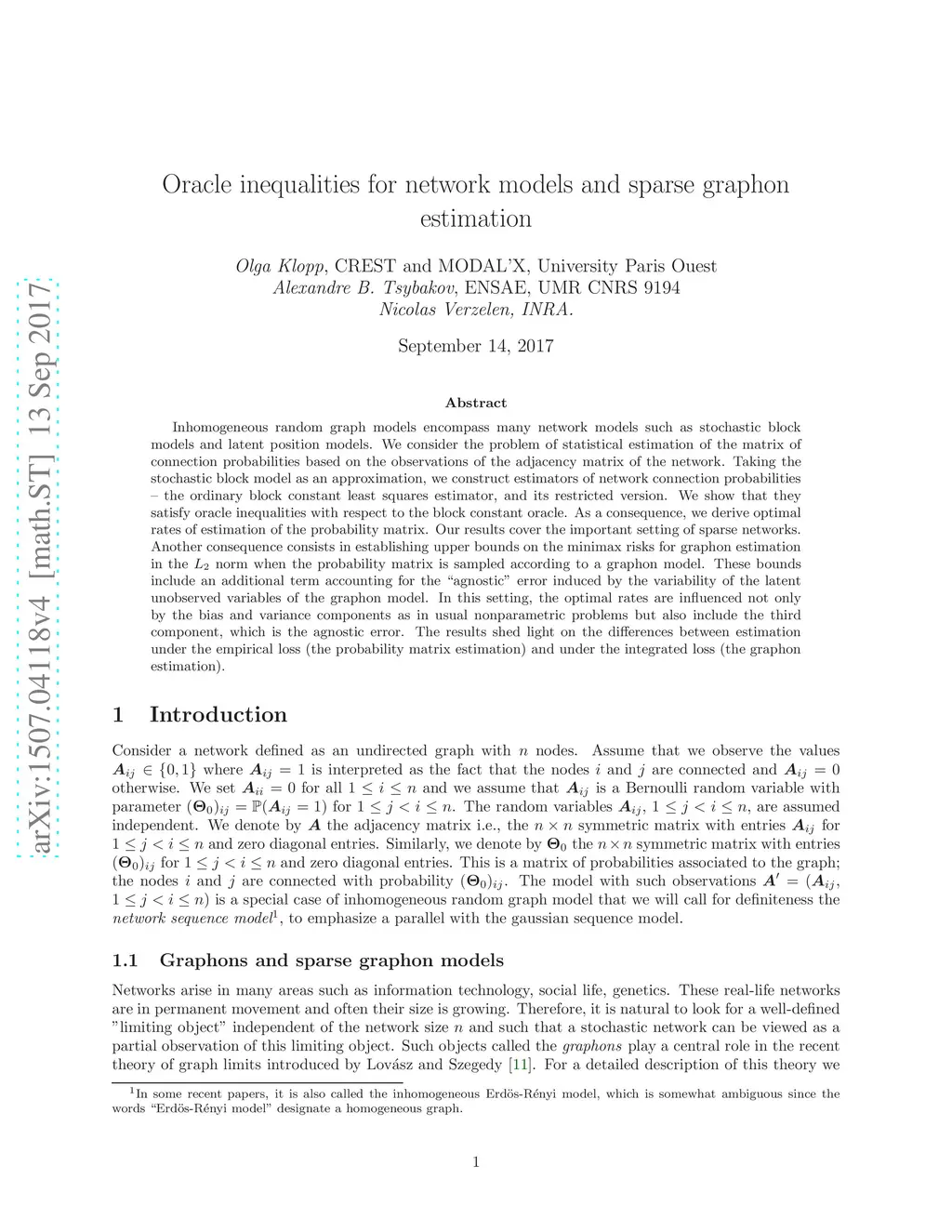 Inhomogeneous random graph models encompass many network models such as stochastic block models and latent position models. We consider the problem of statistical estimation of the matrix of connection probabilities based on the observations of the adjacency matrix of the network. Taking the stochastic block model as an approximation, we construct estimators of network connection probabilities -- the ordinary block constant least squares estimator, and its restricted version. We show that they satisfy oracle inequalities with respect to the block constant oracle. As a consequence, we derive optimal rates of estimation of the probability matrix. Our results cover the important setting of sparse networks. Another consequence consists in establishing upper bounds on the minimax risks for graphon estimation in the norm when the probability matrix is sampled according to a graphon model. These bounds include an additional term accounting for the "agnostic" error induced by the variability of the latent unobserved variables of the graphon model. In this setting, the optimal rates are influenced not only by the bias and variance components as in usual nonparametric problems but also include the third component, which is the agnostic error. The results shed light on the differences between estimation under the empirical loss (the probability matrix estimation) and under the integrated loss (the graphon estimation).