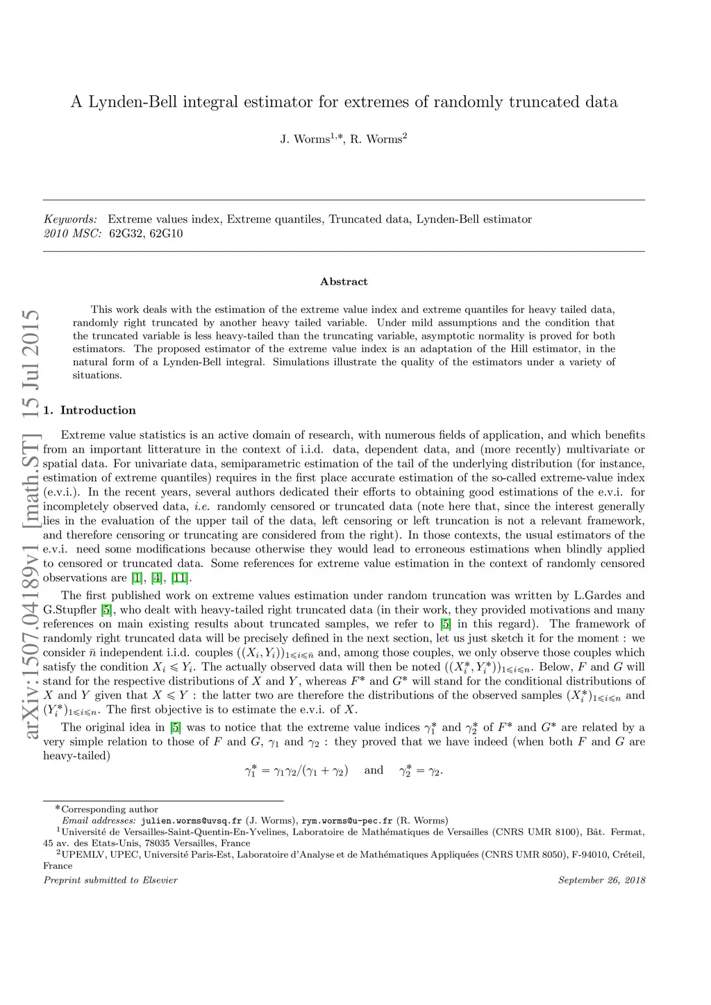 This work deals with the estimation of the extreme value index and extreme quantiles for heavy tailed data,randomly right truncated by another heavy tailed variable. Under mild assumptions and the condition thatthe truncated variable is less heavy-tailed than the truncating variable, asymptotic normality is proved for bothestimators. The proposed estimator of the extreme value index is an adaptation of the Hill estimator, in thenatural form of a Lynden-Bell integral. Simulations illustrate the quality of the estimators under a variety ofsituations.