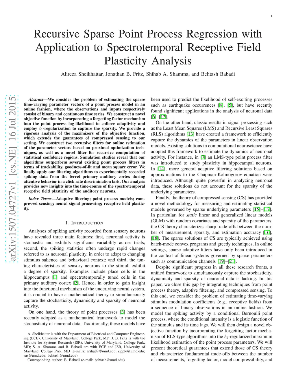 We consider the problem of estimating the sparse time-varying parameter vectors of a point process model in an online fashion, where the observations and inputs respectively consist of binary and continuous time series. We construct a novel objective function by incorporating a forgetting factor mechanism into the point process log-likelihood to enforce adaptivity and employ -regularization to capture the sparsity. We provide a rigorous analysis of the maximizers of the objective function, which extends the guarantees of compressed sensing to our setting. We construct two recursive filters for online estimation of the parameter vectors based on proximal optimization techniques, as well as a novel filter for recursive computation of statistical confidence regions. Simulation studies reveal that our algorithms outperform several existing point process filters in terms of trackability, goodness-of-fit and mean square error. We finally apply our filtering algorithms to experimentally recorded spiking data from the ferret primary auditory cortex during attentive behavior in a click rate discrimination task. Our analysis provides new insights into the time-course of the spectrotemporal receptive field plasticity of the auditory neurons.