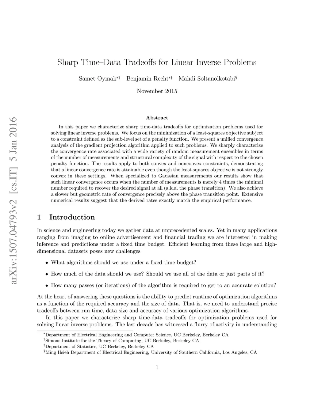 In this paper we characterize sharp time-data tradeoffs for optimization problems used for solving linear inverse problems. We focus on the minimization of a least-squares objective subject to a constraint defined as the sub-level set of a penalty function. We present a unified convergence analysis of the gradient projection algorithm applied to such problems. We sharply characterize the convergence rate associated with a wide variety of random measurement ensembles in terms of the number of measurements and structural complexity of the signal with respect to the chosen penalty function. The results apply to both convex and nonconvex constraints, demonstrating that a linear convergence rate is attainable even though the least squares objective is not strongly convex in these settings. When specialized to Gaussian measurements our results show that such linear convergence occurs when the number of measurements is merely 4 times the minimal number required to recover the desired signal at all (a.k.a. the phase transition). We also achieve a slower but geometric rate of convergence precisely above the phase transition point. Extensive numerical results suggest that the derived rates exactly match the empirical performance.