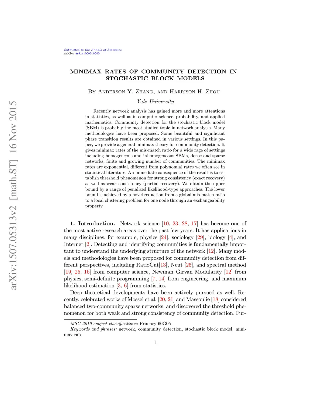Recently network analysis has gained more and more attentions in statistics, as well as in computer science, probability, and applied mathematics. Community detection for the stochastic block model (SBM) is probably the most studied topic in network analysis. Many methodologies have been proposed. Some beautiful and significant phase transition results are obtained in various settings. In this paper, we provide a general minimax theory for community detection. It gives minimax rates of the mis-match ratio for a wide rage of settings including homogeneous and inhomogeneous SBMs, dense and sparse networks, finite and growing number of communities. The minimax rates are exponential, different from polynomial rates we often see in statistical literature. An immediate consequence of the result is to establish threshold phenomenon for strong consistency (exact recovery) as well as weak consistency (partial recovery). We obtain the upper bound by a range of penalized likelihood-type approaches. The lower bound is achieved by a novel reduction from a global mis-match ratio to a local clustering problem for one node through an exchangeability property.