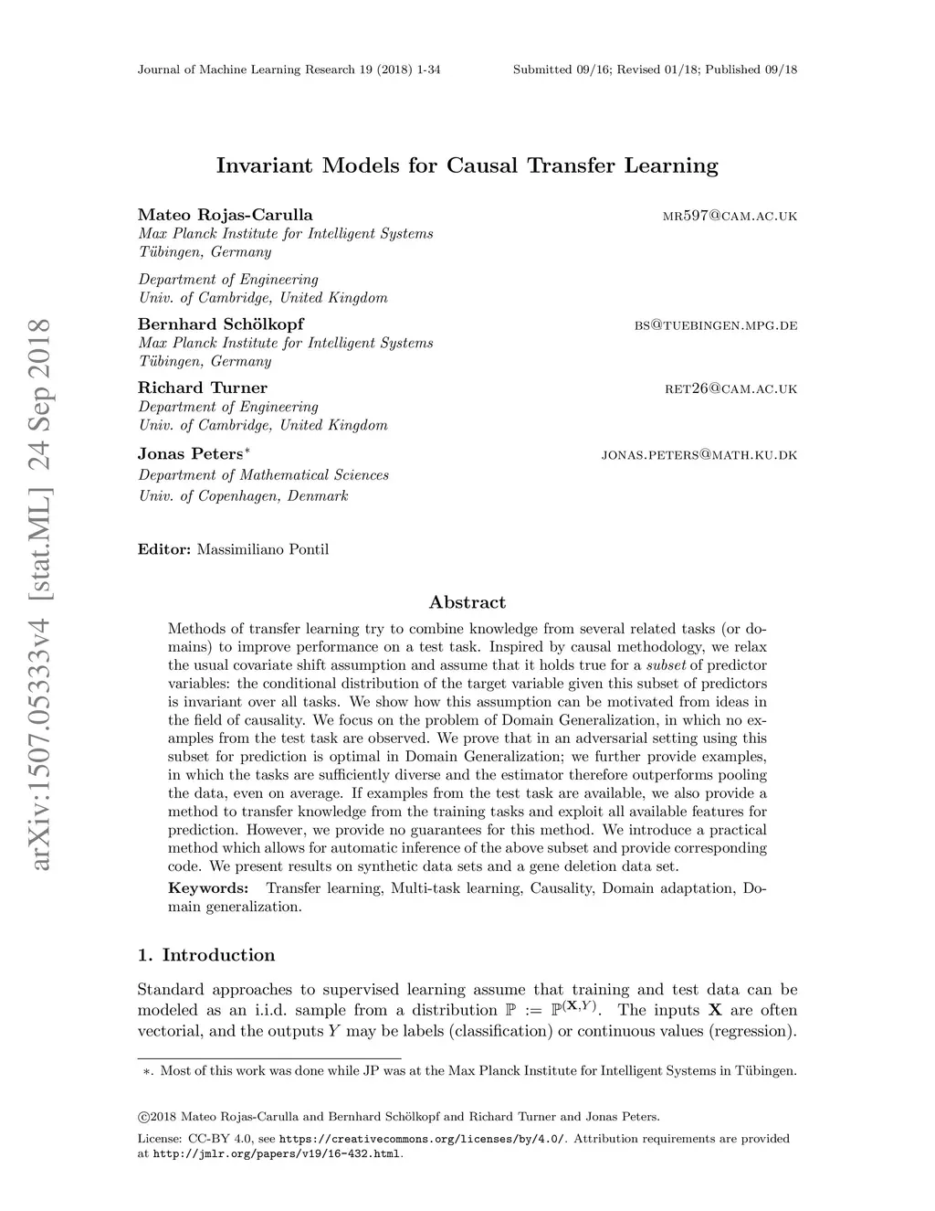 Methods of transfer learning try to combine knowledge from several related tasks (or domains) to improve performance on a test task. Inspired by causal methodology, we relax the usual covariate shift assumption and assume that it holds true for a subset of predictor variables: the conditional distribution of the target variable given this subset of predictors is invariant over all tasks. We show how this assumption can be motivated from ideas in the field of causality. We focus on the problem of Domain Generalization, in which no examples from the test task are observed. We prove that in an adversarial setting using this subset for prediction is optimal in Domain Generalization; we further provide examples, in which the tasks are sufficiently diverse and the estimator therefore outperforms pooling the data, even on average. If examples from the test task are available, we also provide a method to transfer knowledge from the training tasks and exploit all available features for prediction. However, we provide no guarantees for this method. We introduce a practical method which allows for automatic inference of the above subset and provide corresponding code. We present results on synthetic data sets and a gene deletion data set.