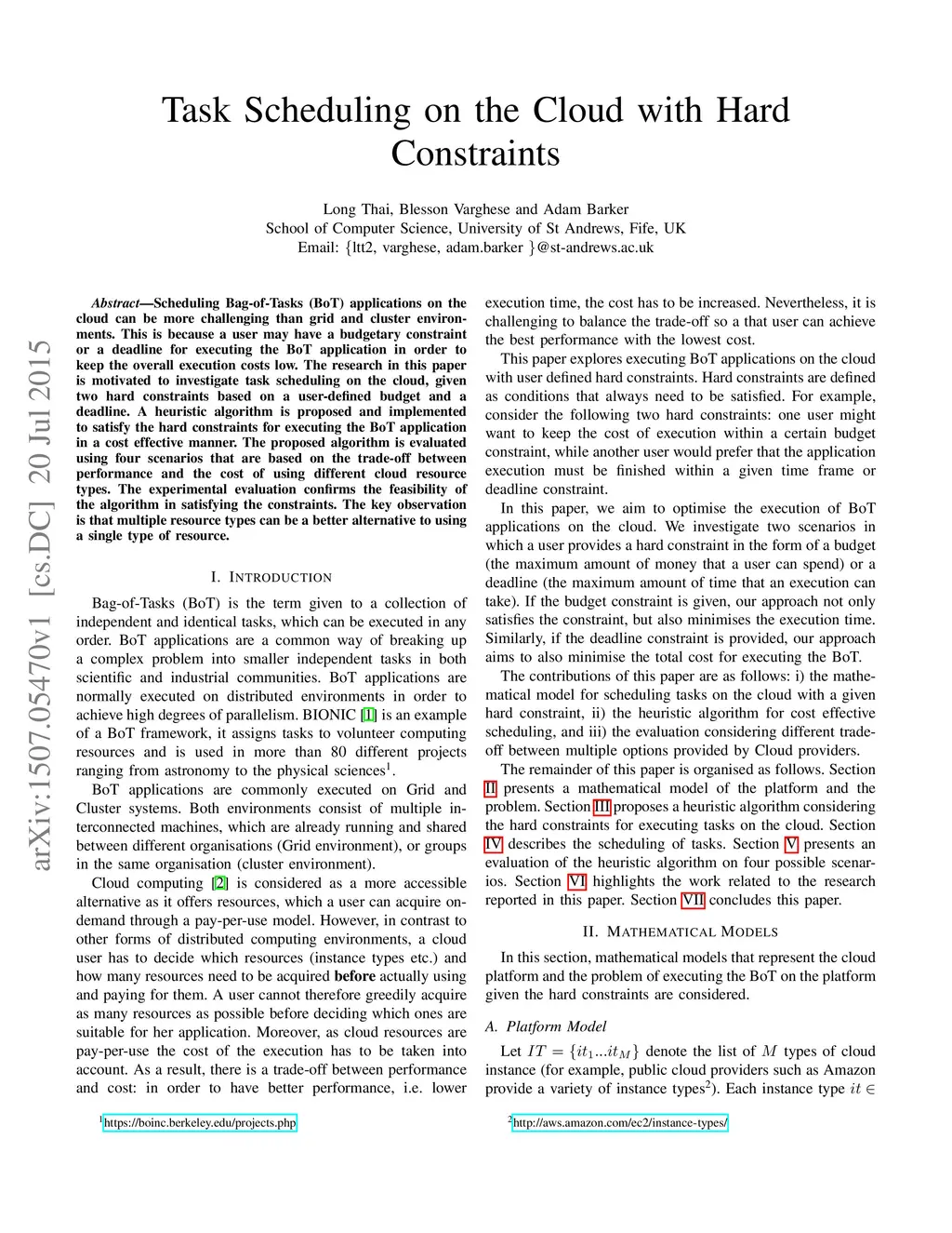 Task Scheduling on the Cloud with Hard Constraints