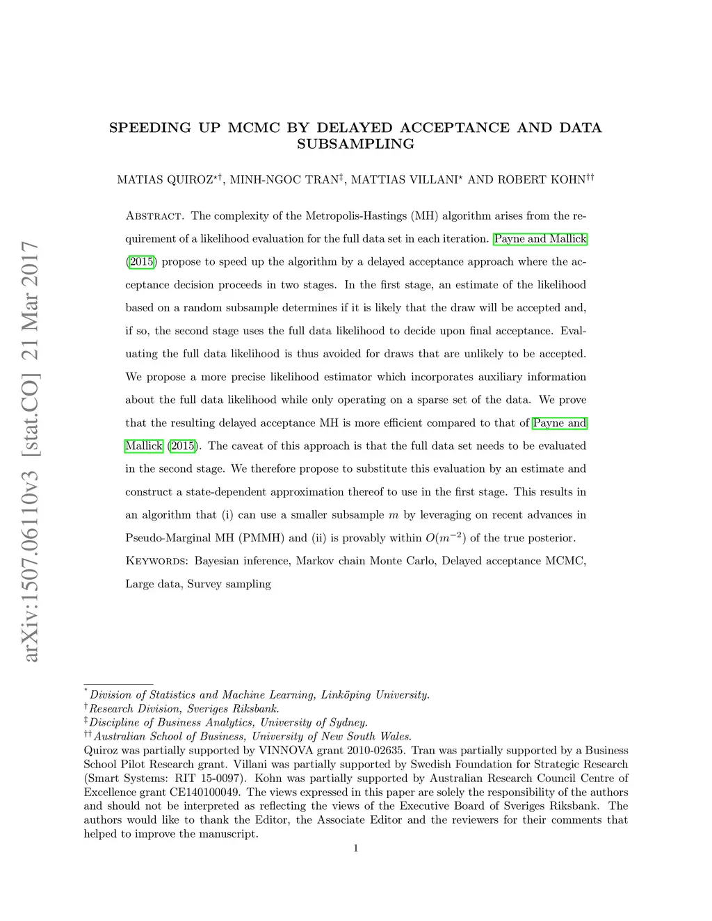 The complexity of the Metropolis-Hastings (MH) algorithm arises from the requirement of a likelihood evaluation for the full data set in each iteration. Payne and Mallick (2015) propose to speed up the algorithm by a delayed acceptance approach where the acceptance decision proceeds in two stages. In the first stage, an estimate of the likelihood based on a random subsample determines if it is likely that the draw will be accepted and, if so, the second stage uses the full data likelihood to decide upon final acceptance. Evaluating the full data likelihood is thus avoided for draws that are unlikely to be accepted. We propose a more precise likelihood estimator which incorporates auxiliary information about the full data likelihood while only operating on a sparse set of the data. It is proved that the resulting delayed acceptance MH is more efficient compared to that of Payne and Mallick (2015). The caveat of this approach is that the full data set needs to be evaluated in the second stage. We therefore propose to substitute this evaluation by an estimate and construct a state-dependent approximation thereof to use in the first stage. This results in an algorithm that (i) can use a smaller subsample m by leveraging on recent advances in Pseudo-Marginal MH (PMMH) and (ii) is provably within of the true posterior.