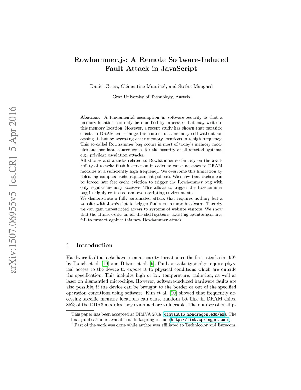 Rowhammer.js: A Remote Software-Induced Fault Attack in JavaScript