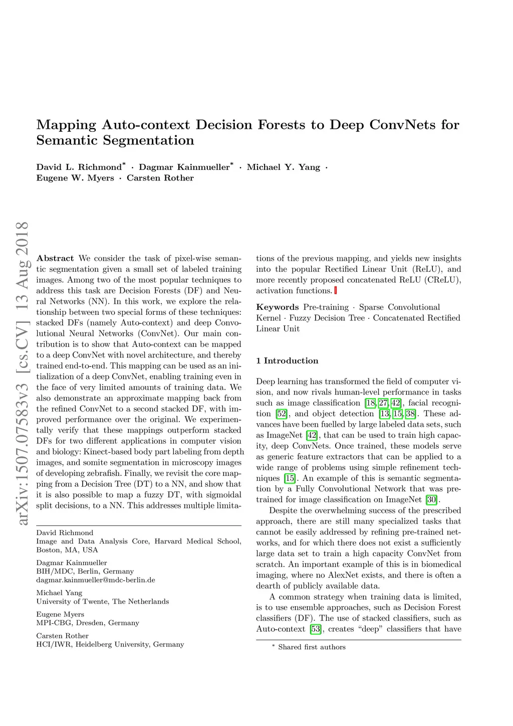 We consider the task of pixel-wise semantic segmentation given a small set of labeled training images. Among two of the most popular techniques to address this task are Decision Forests (DF) and Neural Networks (NN). In this work, we explore the relationship between two special forms of these techniques: stacked DFs (namely Auto-context) and deep Convolutional Neural Networks (ConvNet). Our main contribution is to show that Auto-context can be mapped to a deep ConvNet with novel architecture, and thereby trained end-to-end. This mapping can be used as an initialization of a deep ConvNet, enabling training even in the face of very limited amounts of training data. We also demonstrate an approximate mapping back from the refined ConvNet to a second stacked DF, with improved performance over the original. We experimentally verify that these mappings outperform stacked DFs for two different applications in computer vision and biology: Kinect-based body part labeling from depth images, and somite segmentation in microscopy images of developing zebrafish. Finally, we revisit the core mapping from a Decision Tree (DT) to a NN, and show that it is also possible to map a fuzzy DT, with sigmoidal split decisions, to a NN. This addresses multiple limitations of the previous mapping, and yields new insights into the popular Rectified Linear Unit (ReLU), and more recently proposed concatenated ReLU (CReLU), activation functions.