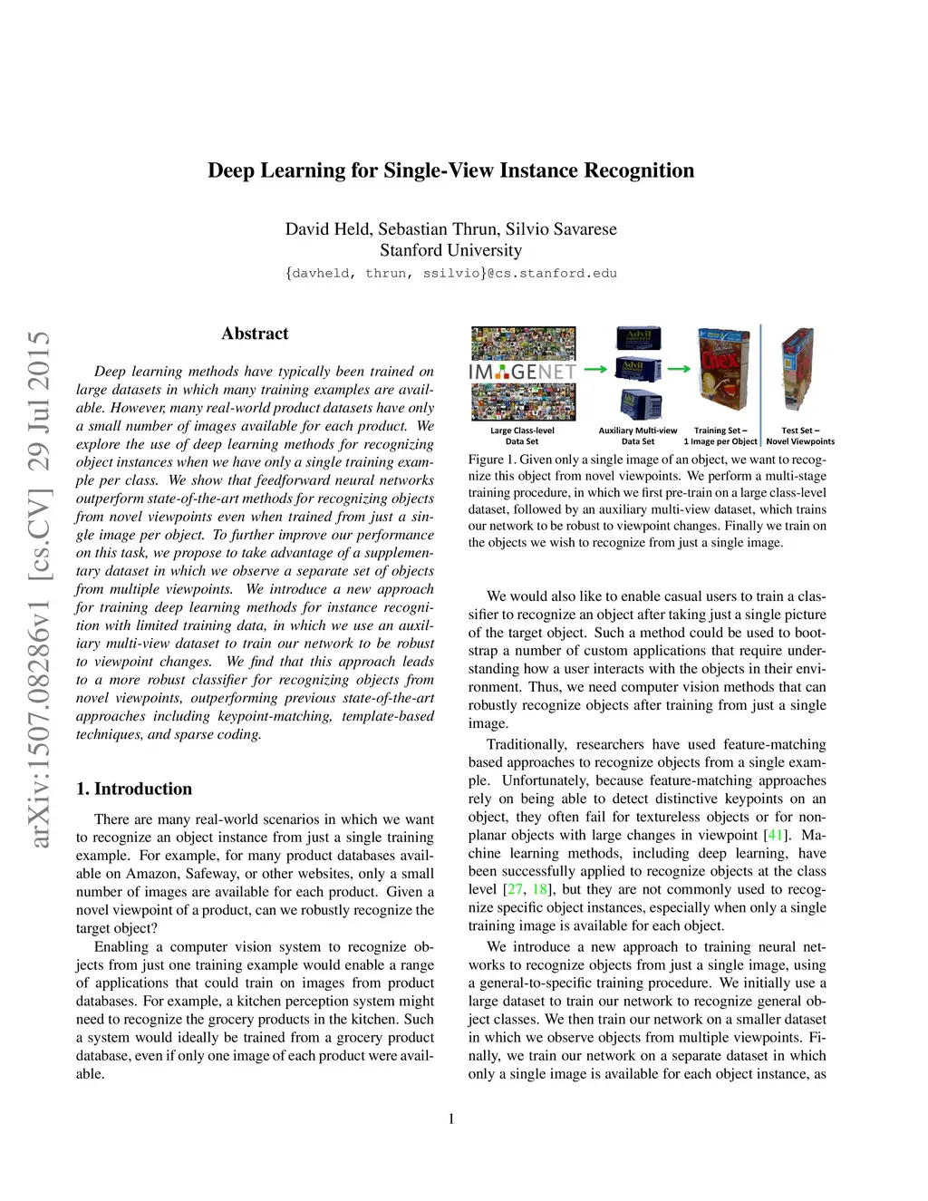 Deep learning methods have typically been trained on large datasets in which many training examples are available. However, many real-world product datasets have only a small number of images available for each product. We explore the use of deep learning methods for recognizing object instances when we have only a single training example per class. We show that feedforward neural networks outperform state-of-the-art methods for recognizing objects from novel viewpoints even when trained from just a single image per object. To further improve our performance on this task, we propose to take advantage of a supplementary dataset in which we observe a separate set of objects from multiple viewpoints. We introduce a new approach for training deep learning methods for instance recognition with limited training data, in which we use an auxiliary multi-view dataset to train our network to be robust to viewpoint changes. We find that this approach leads to a more robust classifier for recognizing objects from novel viewpoints, outperforming previous state-of-the-art approaches including keypoint-matching, template-based techniques, and sparse coding.