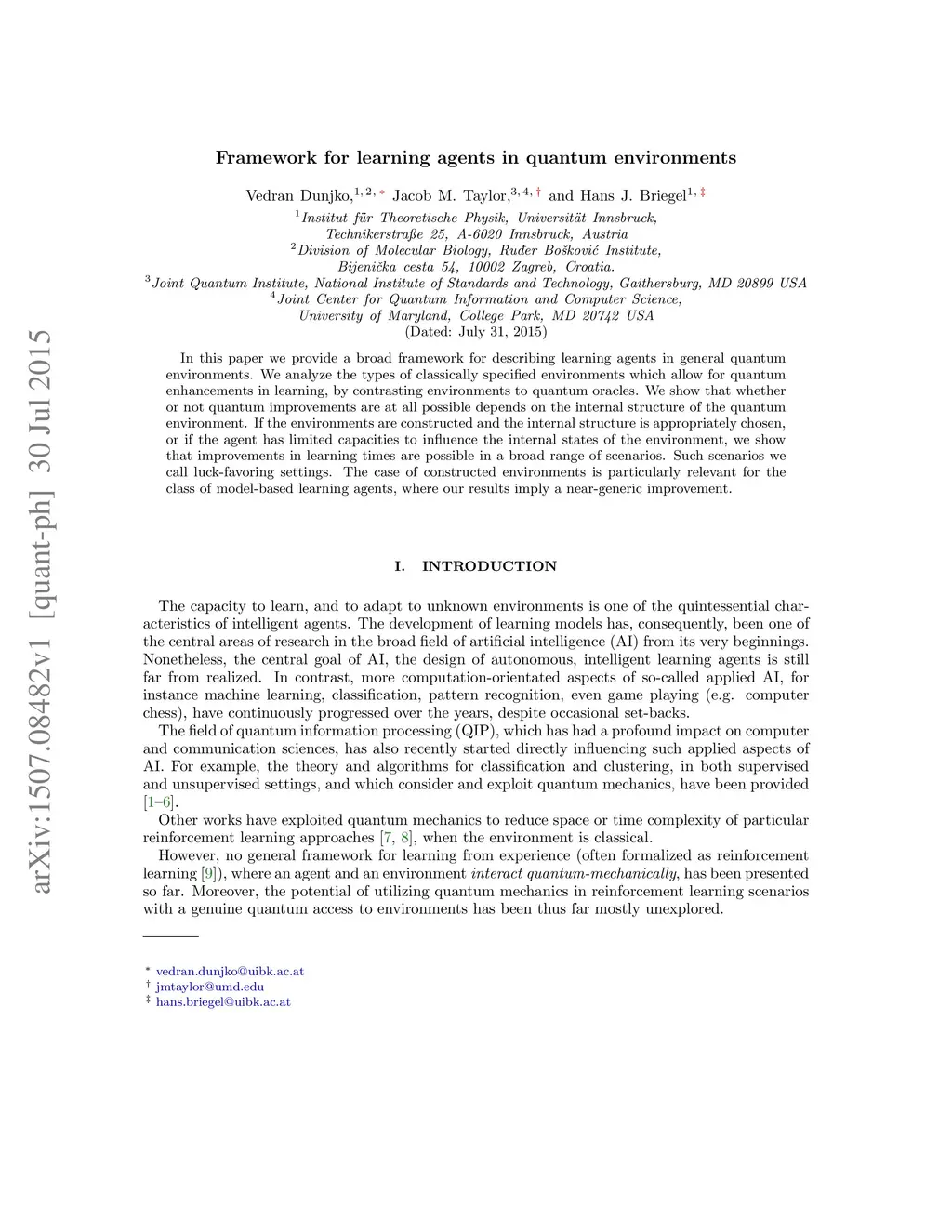 Framework for learning agents in quantum environments