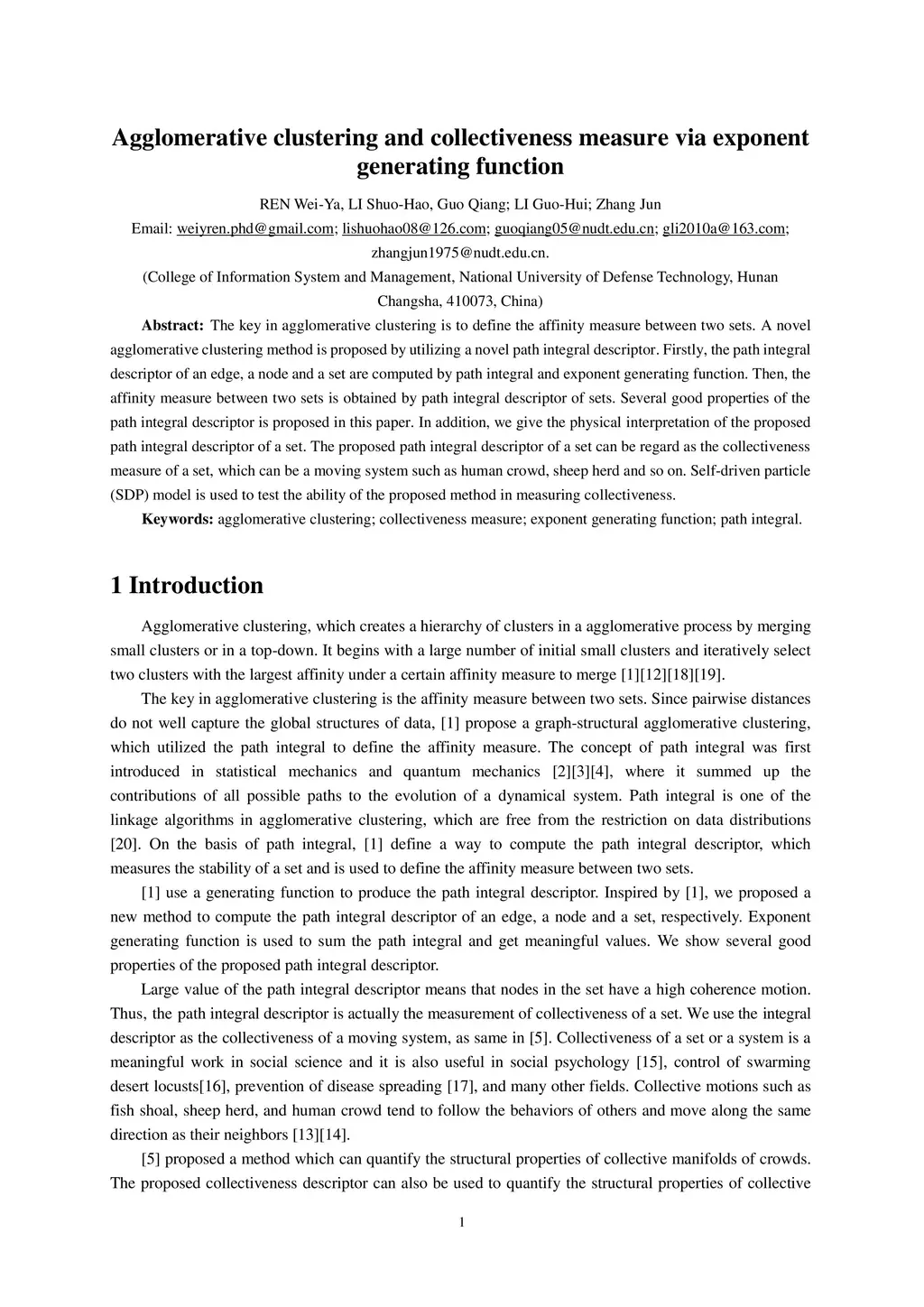 The key in agglomerative clustering is to define the affinity measure between two sets. A novel agglomerative clustering method is proposed by utilizing the path integral to define the affinity measure. Firstly, the path integral descriptor of an edge, a node and a set is computed by path integral and exponent generating function. Then, the affinity measure between two sets is obtained by path integral descriptor of sets. Several good properties of the path integral descriptor is proposed in this paper. In addition, we give the physical interpretation of the proposed path integral descriptor of a set. The proposed path integral descriptor of a set can be regard as the collectiveness measure of a set, which can be a moving system such as human crowd, sheep herd and so on. Self-driven particle (SDP) model is used to test the ability of the proposed method in measuring collectiveness.