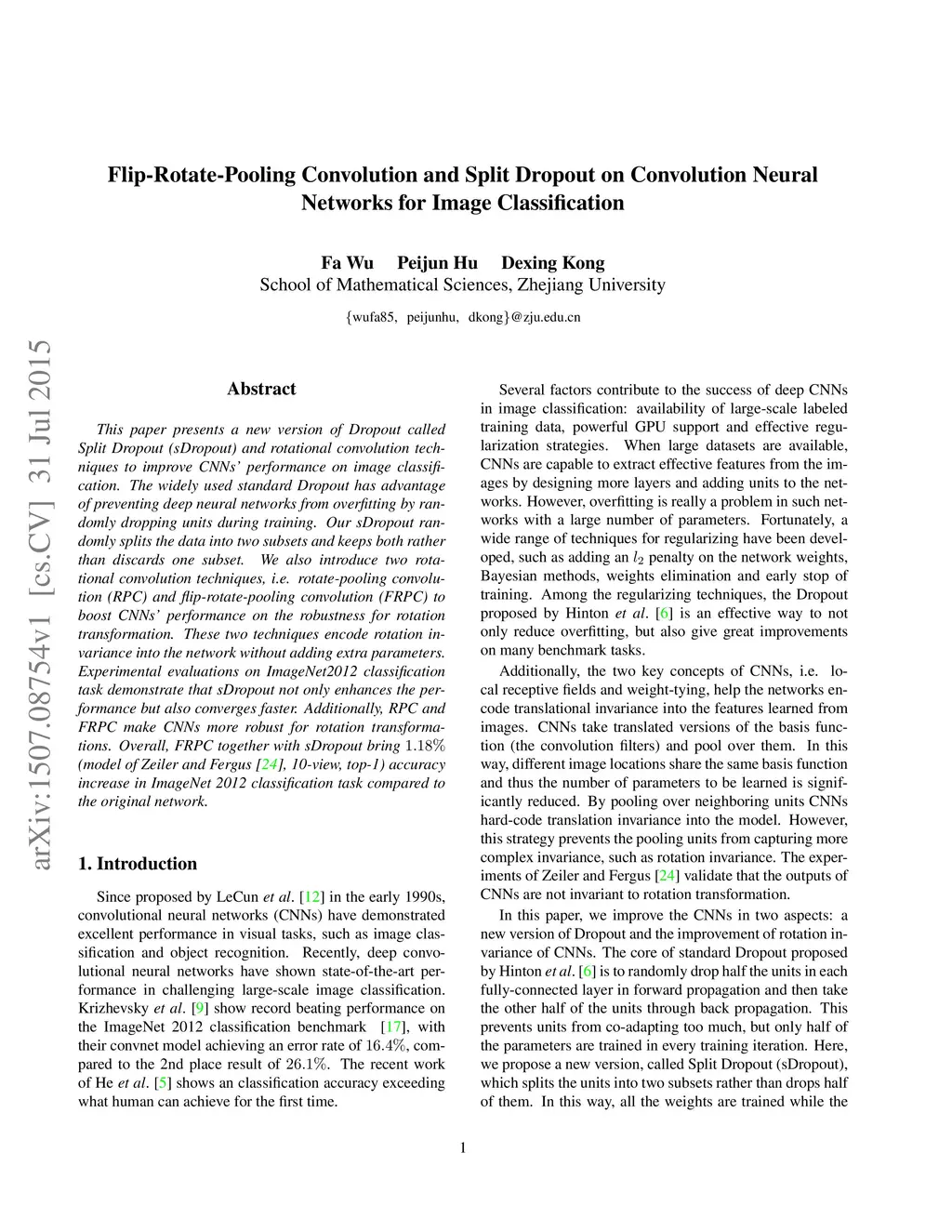 Flip-Rotate-Pooling Convolution and Split Dropout on Convolution Neural