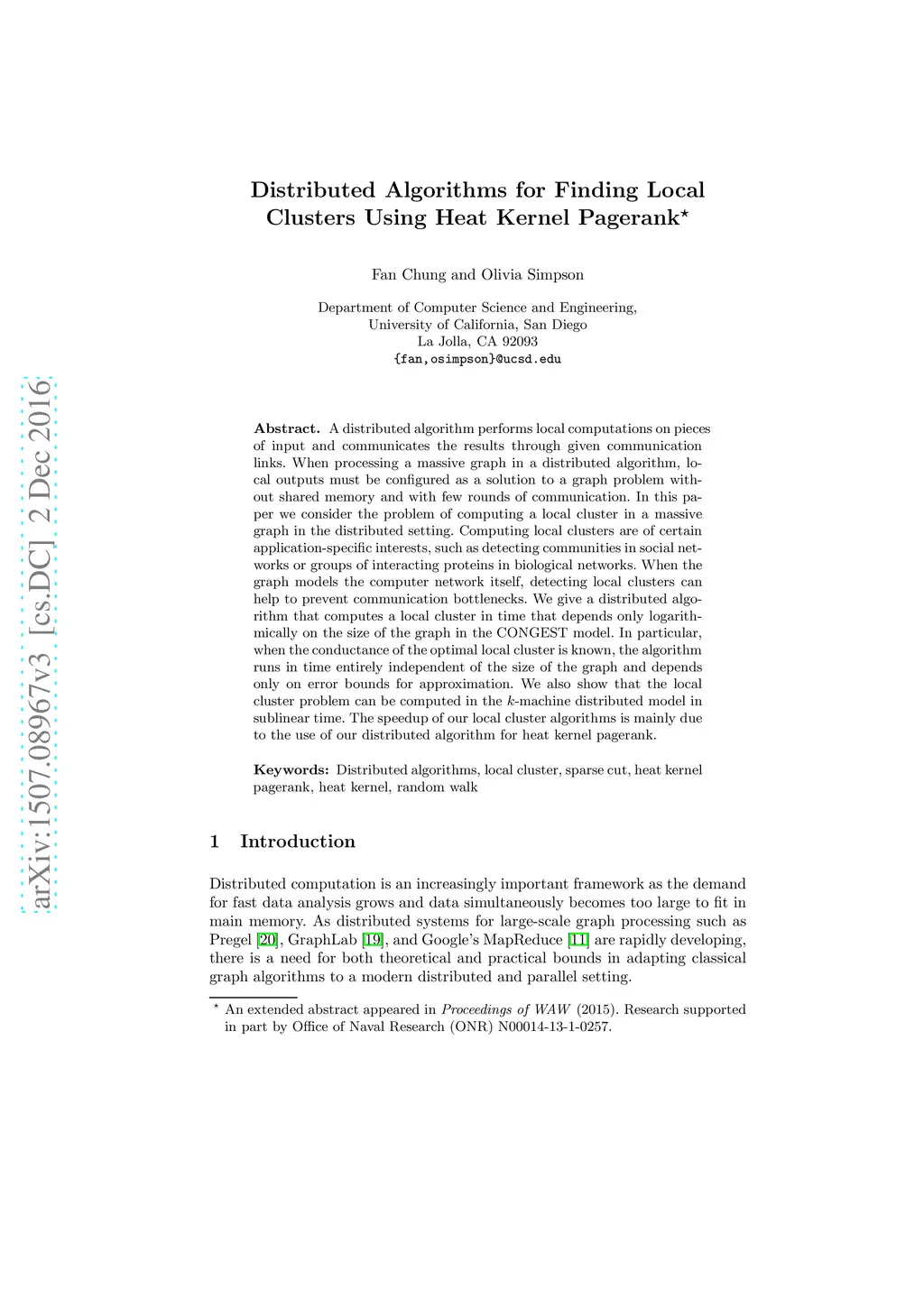 A distributed algorithm performs local computations on pieces of input and communicates the results through given communication links. When processing a massive graph in a distributed algorithm, local outputs must be configured as a solution to a graph problem without shared memory and with few rounds of communication. In this paper we consider the problem of computing a local cluster in a massive graph in the distributed setting. Computing local clusters are of certain application-specific interests, such as detecting communities in social networks or groups of interacting proteins in biological networks. When the graph models the computer network itself, detecting local clusters can help to prevent communication bottlenecks. We give a distributed algorithm that computes a local cluster in time that depends only logarithmically on the size of the graph in the CONGEST model. In particular, when the value of the optimal local cluster is known, the algorithm runs in time entirely independent of the size of the graph and depends only on error bounds for approximation. We also show that the local cluster problem can be computed in the k-machine distributed model in sublinear time. The speedup of our local cluster algorithms is mainly due to the use of our distributed algorithm for heat kernel pagerank.