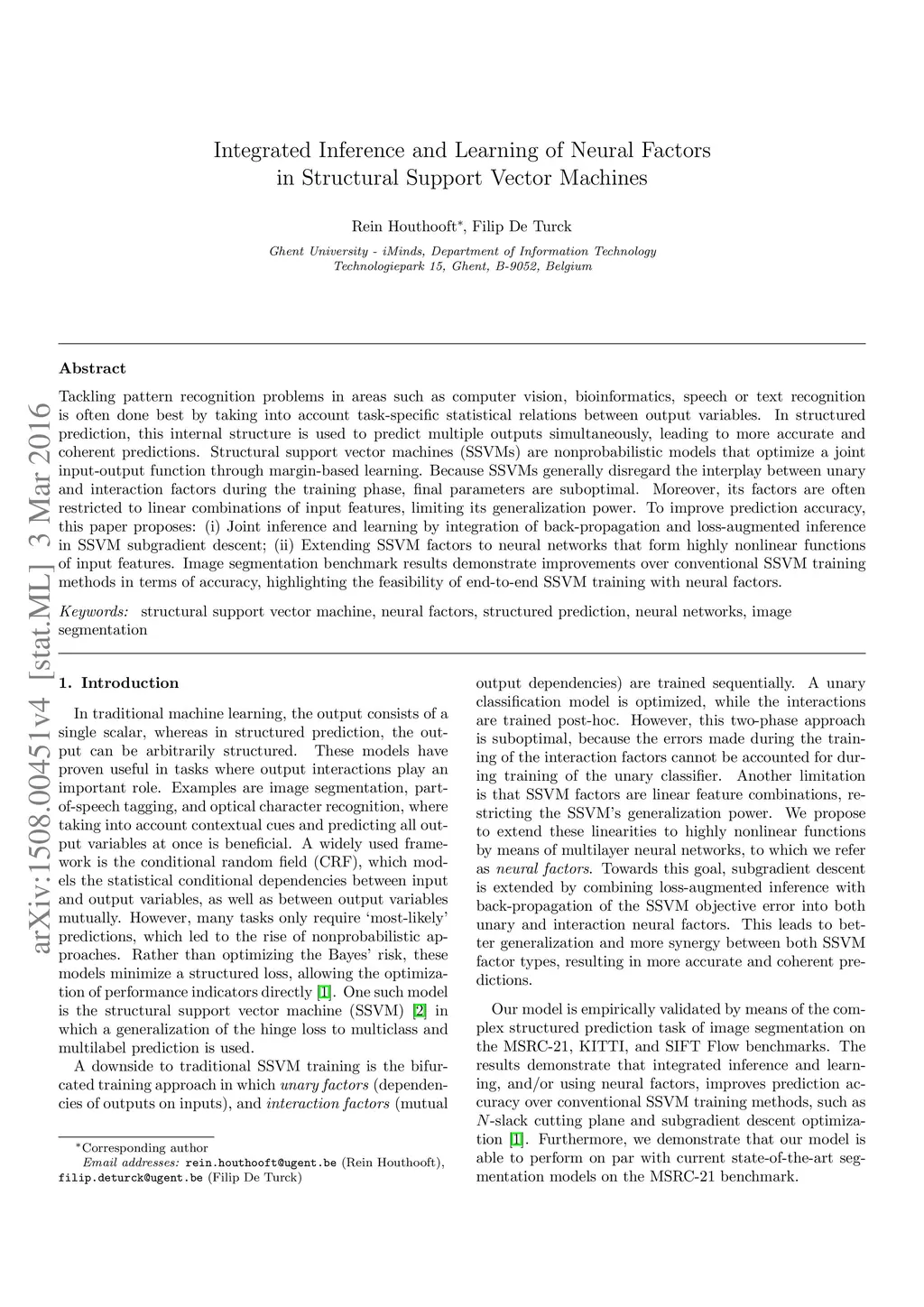 Tackling pattern recognition problems in areas such as computer vision, bioinformatics, speech or text recognition is often done best by taking into account task-specific statistical relations between output variables. In structured prediction, this internal structure is used to predict multiple outputs simultaneously, leading to more accurate and coherent predictions. Structural support vector machines (SSVMs) are nonprobabilistic models that optimize a joint input-output function through margin-based learning. Because SSVMs generally disregard the interplay between unary and interaction factors during the training phase, final parameters are suboptimal. Moreover, its factors are often restricted to linear combinations of input features, limiting its generalization power. To improve prediction accuracy, this paper proposes: (i) Joint inference and learning by integration of back-propagation and loss-augmented inference in SSVM subgradient descent; (ii) Extending SSVM factors to neural networks that form highly nonlinear functions of input features. Image segmentation benchmark results demonstrate improvements over conventional SSVM training methods in terms of accuracy, highlighting the feasibility of end-to-end SSVM training with neural factors.