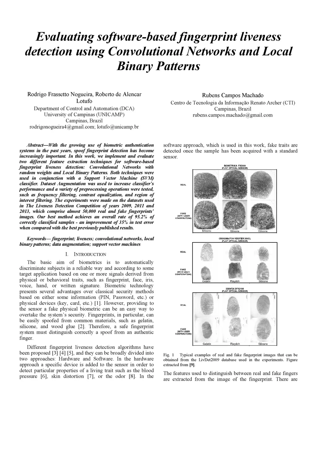 With the growing use of biometric authentication systems in the past years, spoof fingerprint detection has become increasingly important. In this work, we implement and evaluate two different feature extraction techniques for software-based fingerprint liveness detection: Convolutional Networks with random weights and Local Binary Patterns. Both techniques were used in conjunction with a Support Vector Machine (SVM) classifier. Dataset Augmentation was used to increase classifier's performance and a variety of preprocessing operations were tested, such as frequency filtering, contrast equalization, and region of interest filtering. The experiments were made on the datasets used in The Liveness Detection Competition of years 2009, 2011 and 2013, which comprise almost 50,000 real and fake fingerprints' images. Our best method achieves an overall rate of 95.2% of correctly classified samples - an improvement of 35% in test error when compared with the best previously published results.