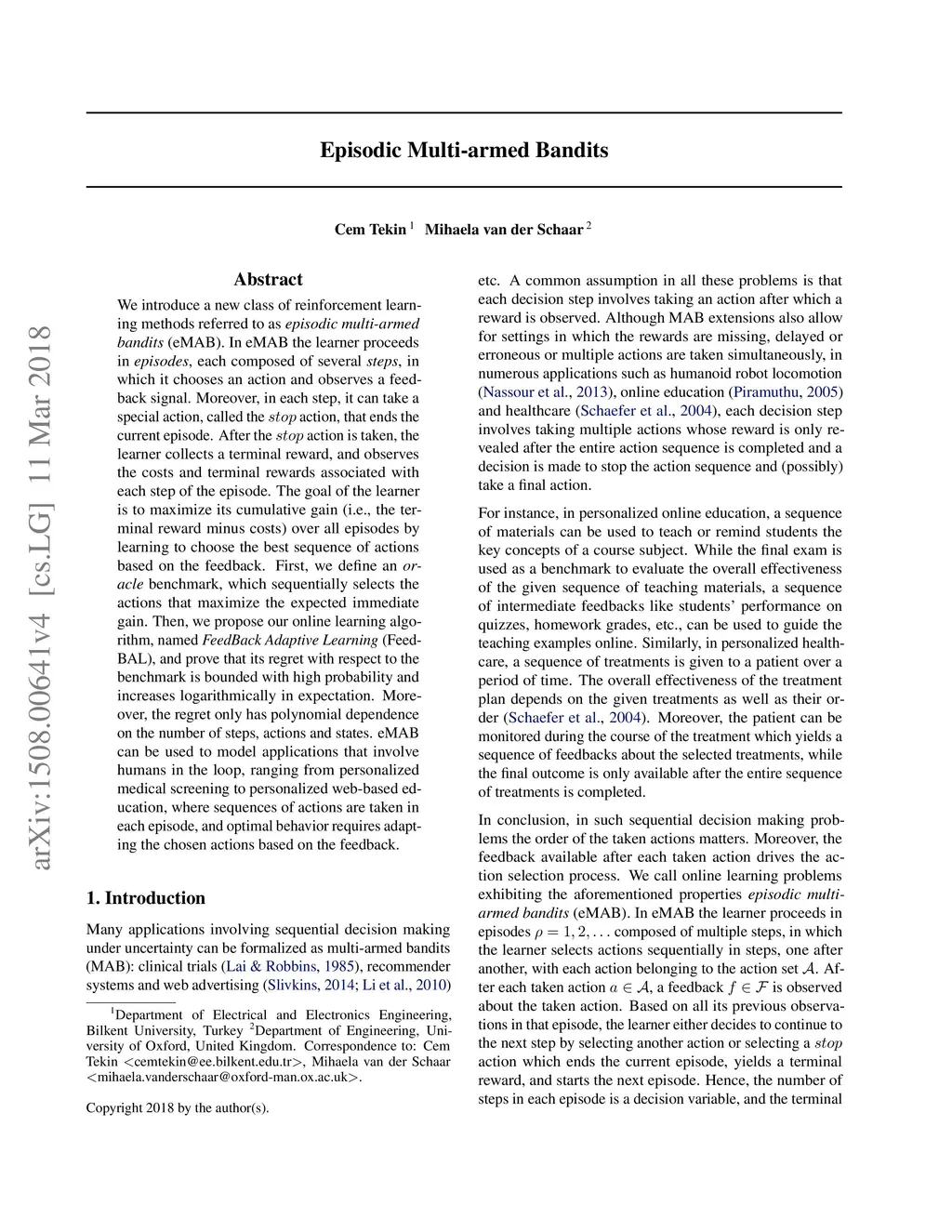 We introduce a new class of reinforcement learning methods referred to as {\em episodic multi-armed bandits} (eMAB). In eMAB the learner proceeds in {\em episodes}, each composed of several {\em steps}, in which it chooses an action and observes a feedback signal. Moreover, in each step, it can take a special action, called the action, that ends the current episode. After the action is taken, the learner collects a terminal reward, and observes the costs and terminal rewards associated with each step of the episode. The goal of the learner is to maximize its cumulative gain (i.e., the terminal reward minus costs) over all episodes by learning to choose the best sequence of actions based on the feedback. First, we define an {\em oracle} benchmark, which sequentially selects the actions that maximize the expected immediate gain. Then, we propose our online learning algorithm, named {\em FeedBack Adaptive Learning} (FeedBAL), and prove that its regret with respect to the benchmark is bounded with high probability and increases logarithmically in expectation. Moreover, the regret only has polynomial dependence on the number of steps, actions and states. eMAB can be used to model applications that involve humans in the loop, ranging from personalized medical screening to personalized web-based education, where sequences of actions are taken in each episode, and optimal behavior requires adapting the chosen actions based on the feedback.