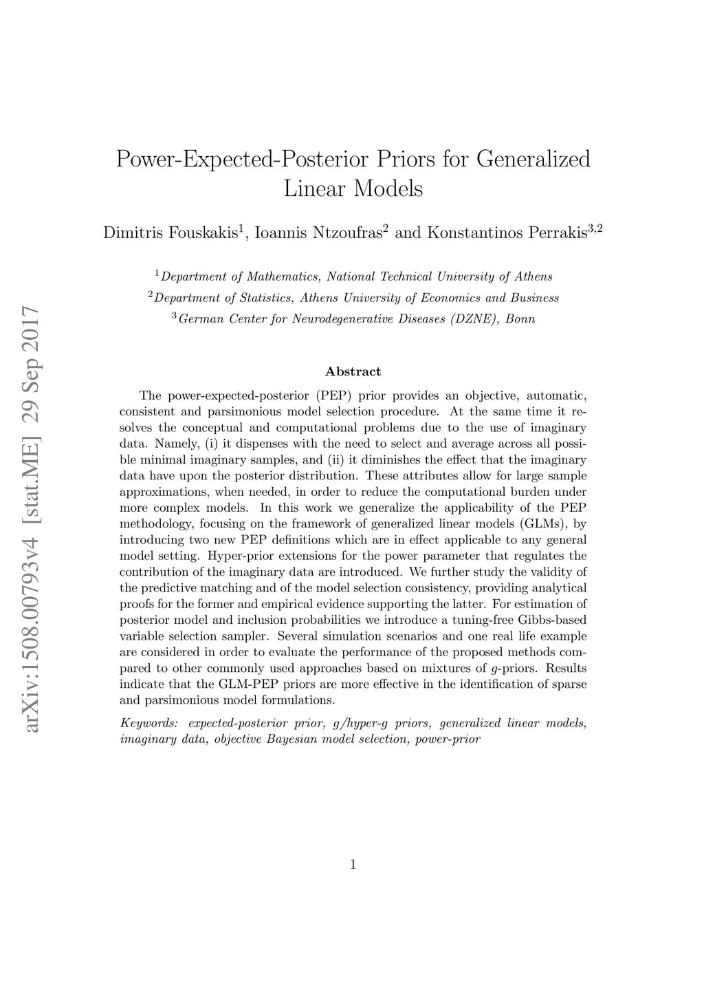 The power-conditional-expected-posterior (PCEP) prior developed for variable selection in normal regression models combines ideas from the power-prior and expected-posterior prior, relying on the concept of random imaginary data, and provides a consistent variable selection method which leads to parsimonious inference. In this paper we discuss the computational limitations of applying the PCEP prior to generalized linear models (GLMs) and present two PCEP prior variations which are easily applicable to regression models belonging to the exponential family of distributions. We highlight the differences between the initial PCEP prior and the two GLM-based PCEP prior adaptations and compare their properties in the conjugate case of the normal linear regression model. Hyper prior extensions for the PCEP power parameter are further considered. We consider several simulation scenarios and one real data example for evaluating the performance of the proposed methods compared to other commonly used methods. Empirical results indicate that the two GLM-PCEP adaptations lead to parsimonious variable selection inference.