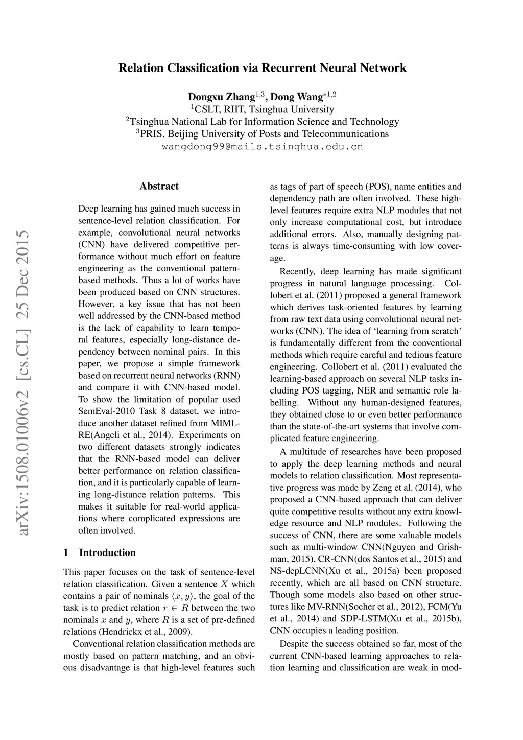 Relation Classification via Recurrent Neural Network