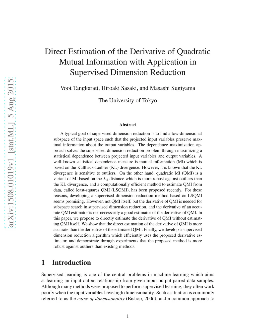 A typical goal of supervised dimension reduction is to find a low-dimensional subspace of the input space such that the projected input variables preserve maximal information about the output variables. The dependence maximization approach solves the supervised dimension reduction problem through maximizing a statistical dependence between projected input variables and output variables. A well-known statistical dependence measure is mutual information (MI) which is based on the Kullback-Leibler (KL) divergence. However, it is known that the KL divergence is sensitive to outliers. On the other hand, quadratic MI (QMI) is a variant of MI based on the distance which is more robust against outliers than the KL divergence, and a computationally efficient method to estimate QMI from data, called least-squares QMI (LSQMI), has been proposed recently. For these reasons, developing a supervised dimension reduction method based on LSQMI seems promising. However, not QMI itself, but the derivative of QMI is needed for subspace search in supervised dimension reduction, and the derivative of an accurate QMI estimator is not necessarily a good estimator of the derivative of QMI. In this paper, we propose to directly estimate the derivative of QMI without estimating QMI itself. We show that the direct estimation of the derivative of QMI is more accurate than the derivative of the estimated QMI. Finally, we develop a supervised dimension reduction algorithm which efficiently uses the proposed derivative estimator, and demonstrate through experiments that the proposed method is more robust against outliers than existing methods.