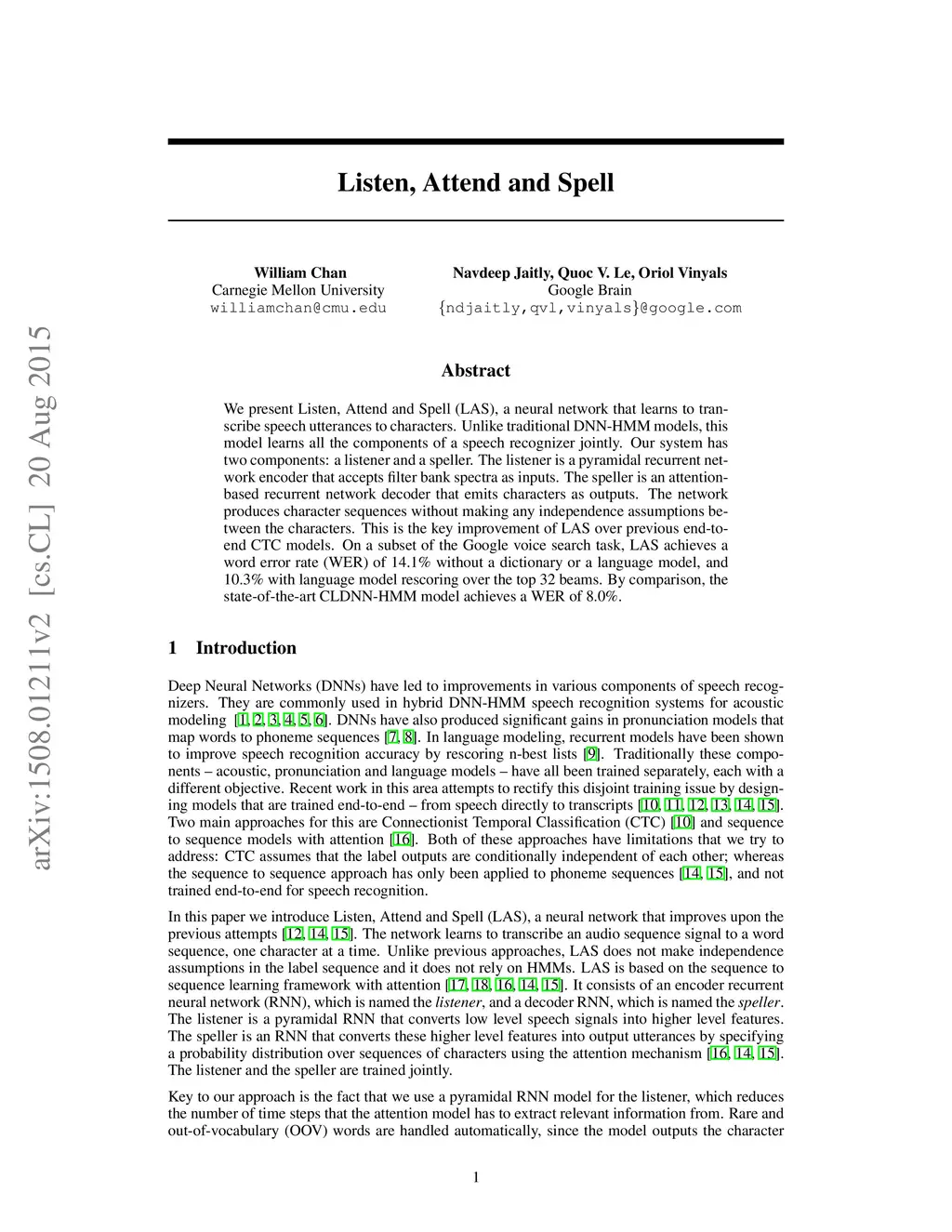 We present Listen, Attend and Spell (LAS), a neural network that learns to transcribe speech utterances to characters. Unlike traditional DNN-HMM models, this model learns all the components of a speech recognizer jointly. Our system has two components: a listener and a speller. The listener is a pyramidal recurrent network encoder that accepts filter bank spectra as inputs. The speller is an attention-based recurrent network decoder that emits characters as outputs. The network produces character sequences without making any independence assumptions between the characters. This is the key improvement of LAS over previous end-to-end CTC models. On a subset of the Google voice search task, LAS achieves a word error rate (WER) of 14.1% without a dictionary or a language model, and 10.3% with language model rescoring over the top 32 beams. By comparison, the state-of-the-art CLDNN-HMM model achieves a WER of 8.0%.