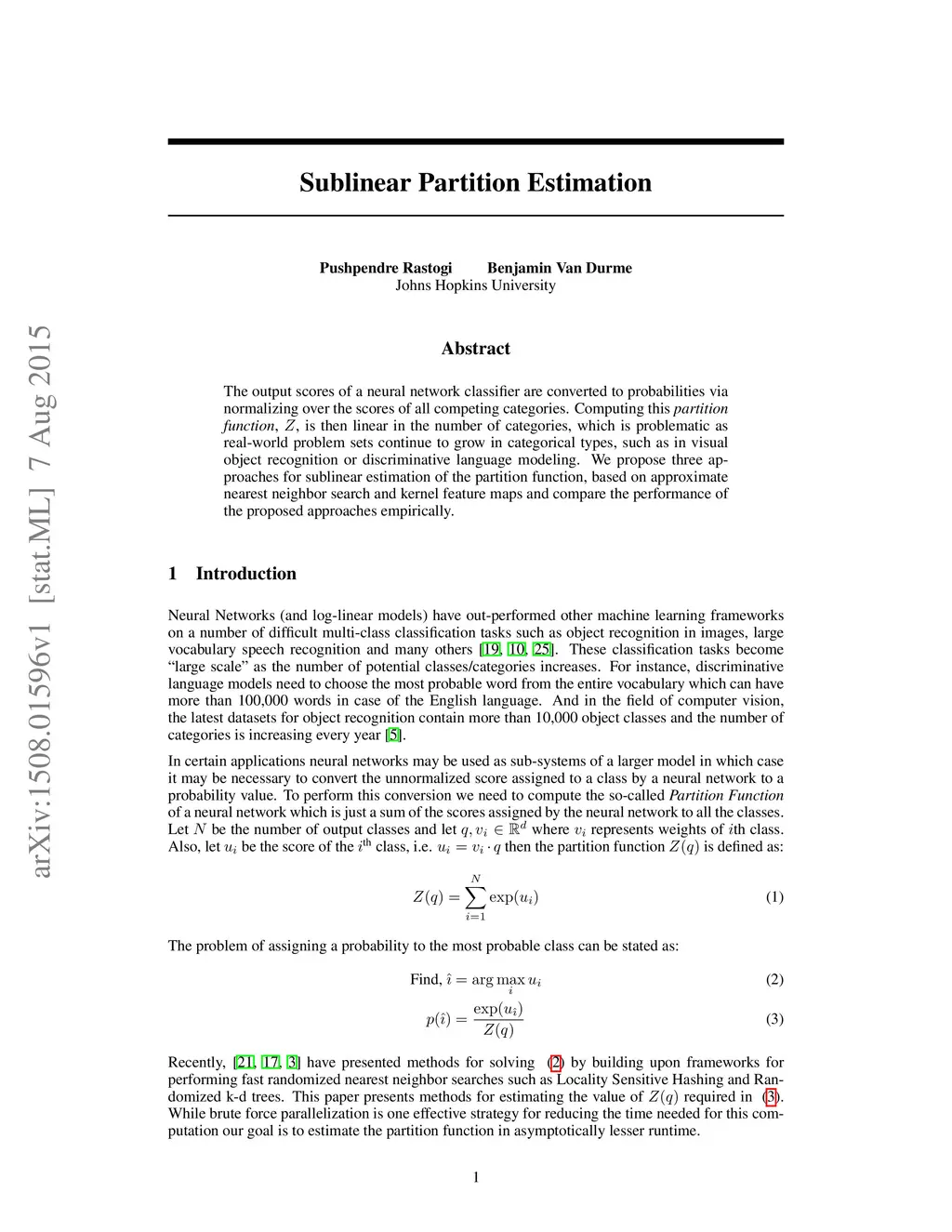 The output scores of a neural network classifier are converted to probabilities via normalizing over the scores of all competing categories. Computing this partition function, , is then linear in the number of categories, which is problematic as real-world problem sets continue to grow in categorical types, such as in visual object recognition or discriminative language modeling. We propose three approaches for sublinear estimation of the partition function, based on approximate nearest neighbor search and kernel feature maps and compare the performance of the proposed approaches empirically.