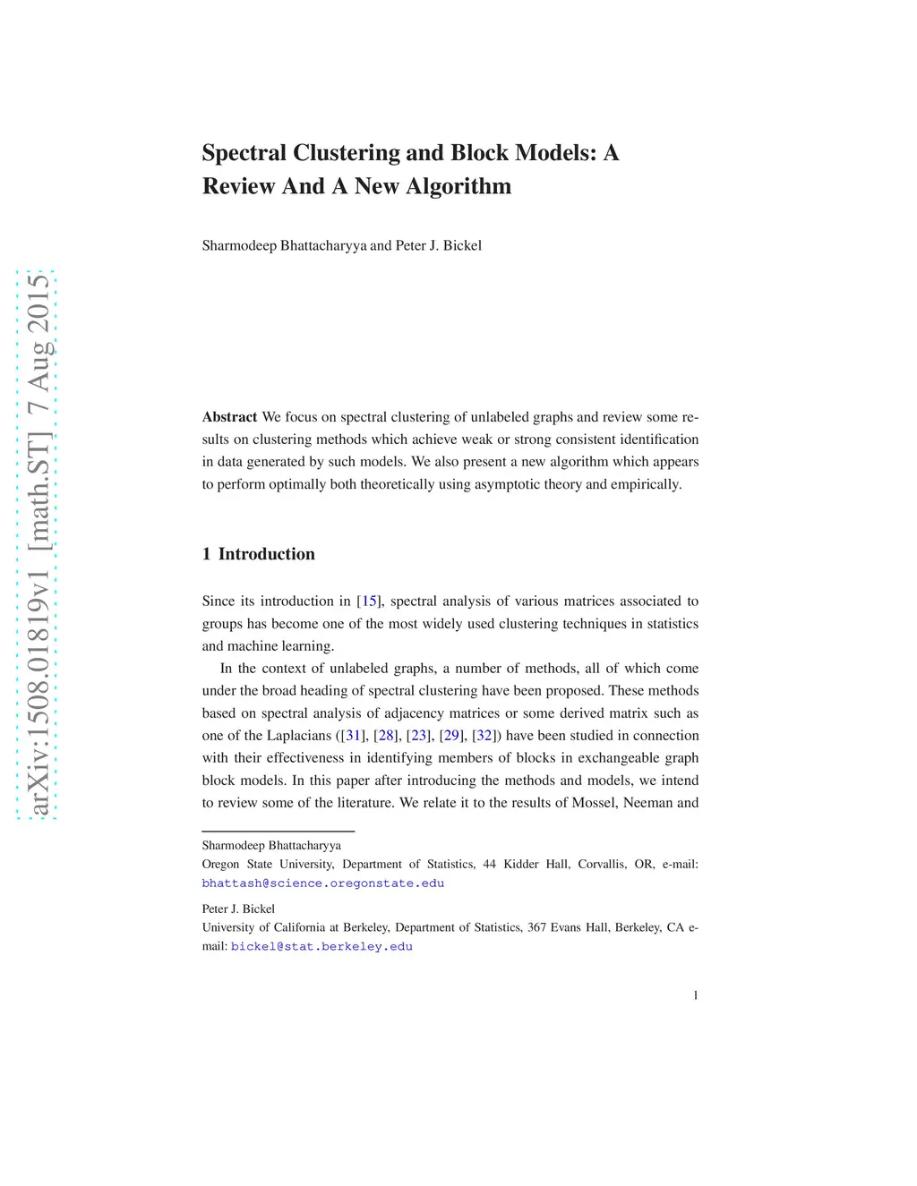 We focus on spectral clustering of unlabeled graphs and review some results on clustering methods which achieve weak or strong consistent identification in data generated by such models. We also present a new algorithm which appears to perform optimally both theoretically using asymptotic theory and empirically.