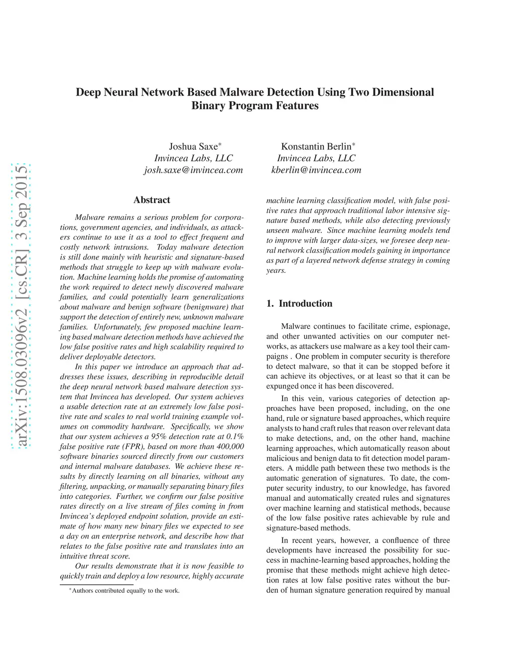 Malware remains a serious problem for corporations, government agencies, and individuals, as attackers continue to use it as a tool to effect frequent and costly network intrusions. Machine learning holds the promise of automating the work required to detect newly discovered malware families, and could potentially learn generalizations about malware and benign software that support the detection of entirely new, unknown malware families. Unfortunately, few proposed machine learning based malware detection methods have achieved the low false positive rates required to deliver deployable detectors. In this paper we a deep neural network malware classifier that achieves a usable detection rate at an extremely low false positive rate and scales to real world training example volumes on commodity hardware. Specifically, we show that our system achieves a 95% detection rate at 0.1% false positive rate (FPR), based on more than 400,000 software binaries sourced directly from our customers and internal malware databases. We achieve these results by directly learning on all binaries, without any filtering, unpacking, or manually separating binary files into categories. Further, we confirm our false positive rates directly on a live stream of files coming in from Invincea's deployed endpoint solution, provide an estimate of how many new binary files we expected to see a day on an enterprise network, and describe how that relates to the false positive rate and translates into an intuitive threat score. Our results demonstrate that it is now feasible to quickly train and deploy a low resource, highly accurate machine learning classification model, with false positive rates that approach traditional labor intensive signature based methods, while also detecting previously unseen malware.