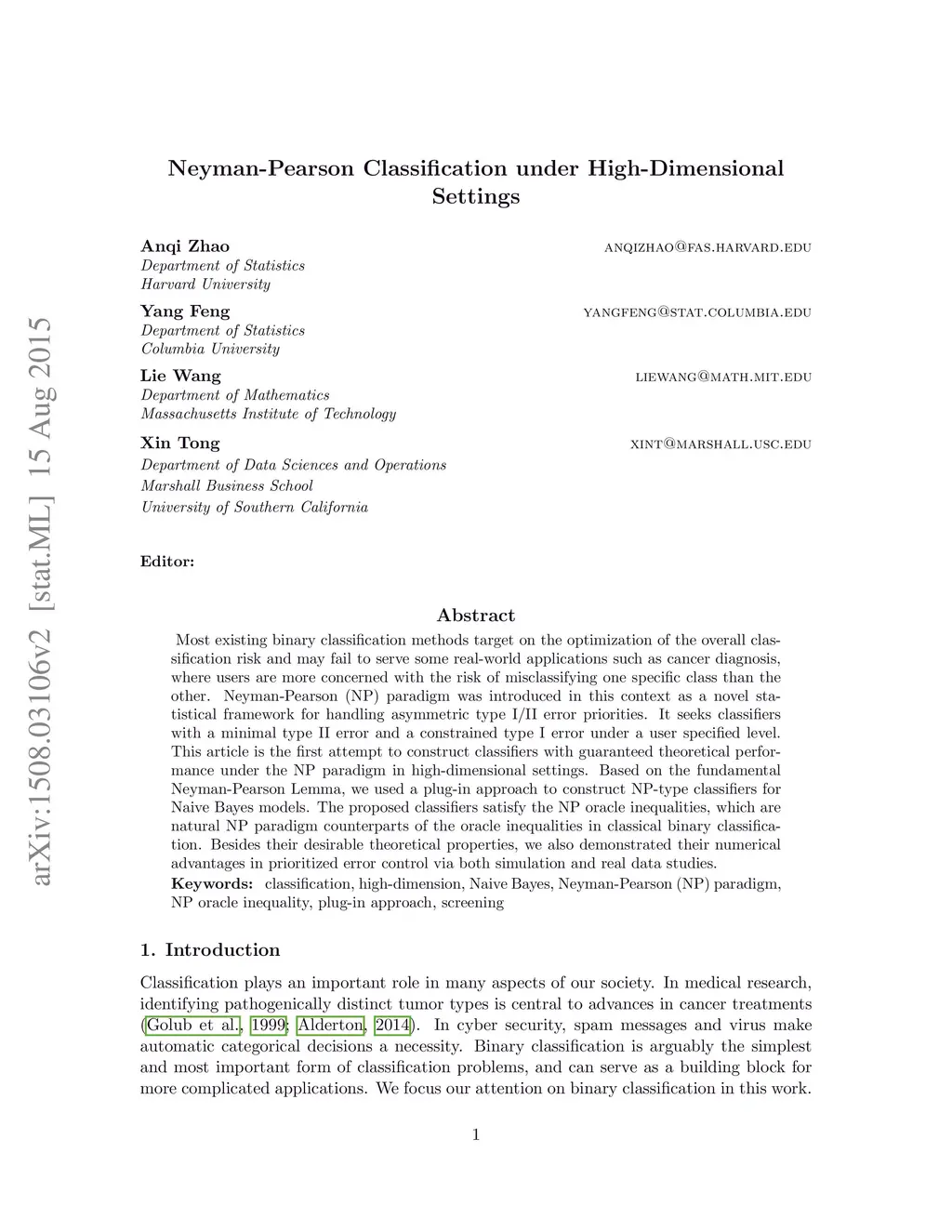 Most existing binary classification methods target on the optimization of the overall classification risk and may fail to serve some real-world applications such as cancer diagnosis, where users are more concerned with the risk of misclassifying one specific class than the other. Neyman-Pearson (NP) paradigm was introduced in this context as a novel statistical framework for handling asymmetric type I/II error priorities. It seeks classifiers with a minimal type II error and a constrained type I error under a user specified level. This article is the first attempt to construct classifiers with guaranteed theoretical performance under the NP paradigm in high-dimensional settings. Based on the fundamental Neyman-Pearson Lemma, we used a plug-in approach to construct NP-type classifiers for Naive Bayes models. The proposed classifiers satisfy the NP oracle inequalities, which are natural NP paradigm counterparts of the oracle inequalities in classical binary classification. Besides their desirable theoretical properties, we also demonstrated their numerical advantages in prioritized error control via both simulation and real data studies.