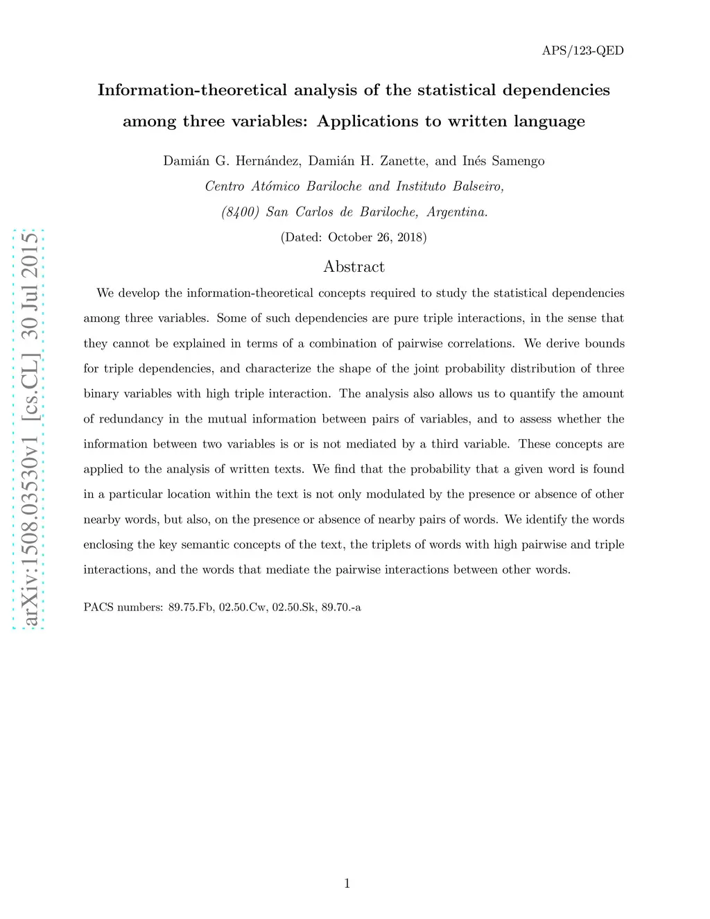We develop the information-theoretical concepts required to study the statistical dependencies among three variables. Some of such dependencies are pure triple interactions, in the sense that they cannot be explained in terms of a combination of pairwise correlations. We derive bounds for triple dependencies, and characterize the shape of the joint probability distribution of three binary variables with high triple interaction. The analysis also allows us to quantify the amount of redundancy in the mutual information between pairs of variables, and to assess whether the information between two variables is or is not mediated by a third variable. These concepts are applied to the analysis of written texts. We find that the probability that a given word is found in a particular location within the text is not only modulated by the presence or absence of other nearby words, but also, on the presence or absence of nearby pairs of words. We identify the words enclosing the key semantic concepts of the text, the triplets of words with high pairwise and triple interactions, and the words that mediate the pairwise interactions between other words.