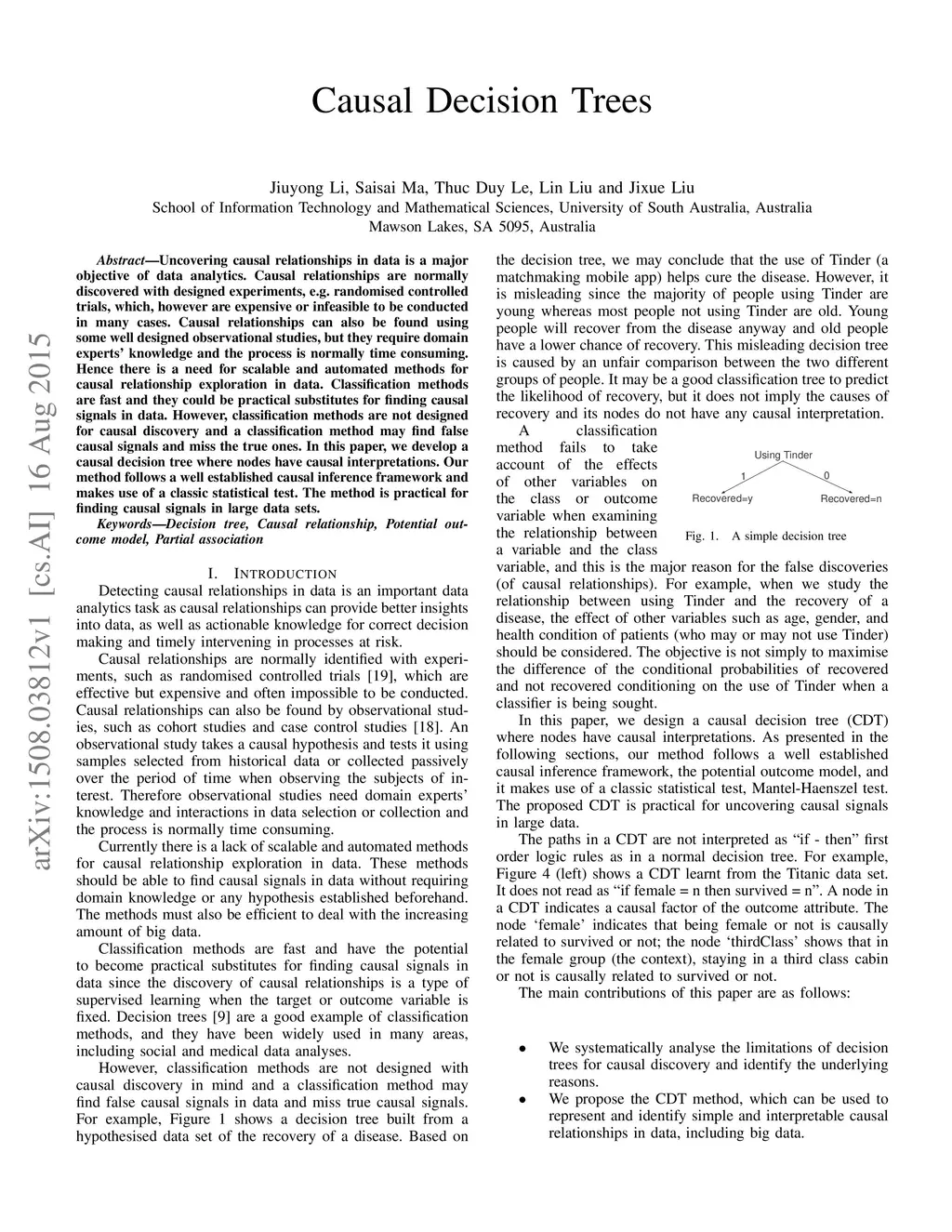 Uncovering causal relationships in data is a major objective of data analytics. Causal relationships are normally discovered with designed experiments, e.g. randomised controlled trials, which, however are expensive or infeasible to be conducted in many cases. Causal relationships can also be found using some well designed observational studies, but they require domain experts' knowledge and the process is normally time consuming. Hence there is a need for scalable and automated methods for causal relationship exploration in data. Classification methods are fast and they could be practical substitutes for finding causal signals in data. However, classification methods are not designed for causal discovery and a classification method may find false causal signals and miss the true ones. In this paper, we develop a causal decision tree where nodes have causal interpretations. Our method follows a well established causal inference framework and makes use of a classic statistical test. The method is practical for finding causal signals in large data sets.