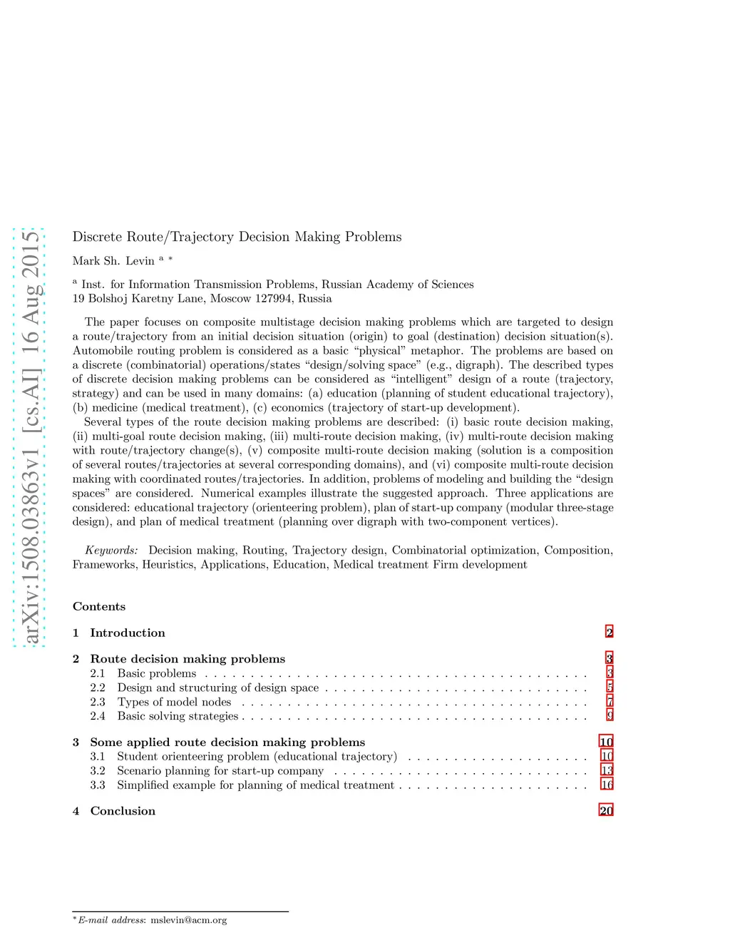 The paper focuses on composite multistage decision making problems which are targeted to design a route/trajectory from an initial decision situation (origin) to goal (destination) decision situation(s). Automobile routing problem is considered as a basic physical metaphor. The problems are based on a discrete (combinatorial) operations/states design/solving space (e.g., digraph). The described types of discrete decision making problems can be considered as intelligent design of a route (trajectory, strategy) and can be used in many domains: (a) education (planning of student educational trajectory), (b) medicine (medical treatment), (c) economics (trajectory of start-up development). Several types of the route decision making problems are described: (i) basic route decision making, (ii) multi-goal route decision making, (iii) multi-route decision making, (iv) multi-route decision making with route/trajectory change(s), (v) composite multi-route decision making (solution is a composition of several routes/trajectories at several corresponding domains), and (vi) composite multi-route decision making with coordinated routes/trajectories. In addition, problems of modeling and building the design spaces are considered. Numerical examples illustrate the suggested approach. Three applications are considered: educational trajectory (orienteering problem), plan of start-up company (modular three-stage design), and plan of medical treatment (planning over digraph with two-component vertices).