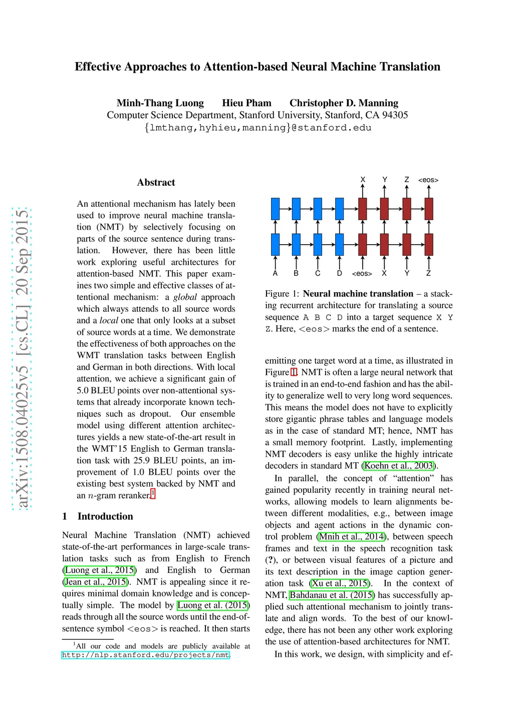 An attentional mechanism has lately been used to improve neural machine translation (NMT) by selectively focusing on parts of the source sentence during translation. However, there has been little work exploring useful architectures for attention-based NMT. This paper examines two simple and effective classes of attentional mechanism: a global approach which always attends to all source words and a local one that only looks at a subset of source words at a time. We demonstrate the effectiveness of both approaches over the WMT translation tasks between English and German in both directions. With local attention, we achieve a significant gain of 5.0 BLEU points over non-attentional systems which already incorporate known techniques such as dropout. Our ensemble model using different attention architectures has established a new state-of-the-art result in the WMT'15 English to German translation task with 25.9 BLEU points, an improvement of 1.0 BLEU points over the existing best system backed by NMT and an n-gram reranker.