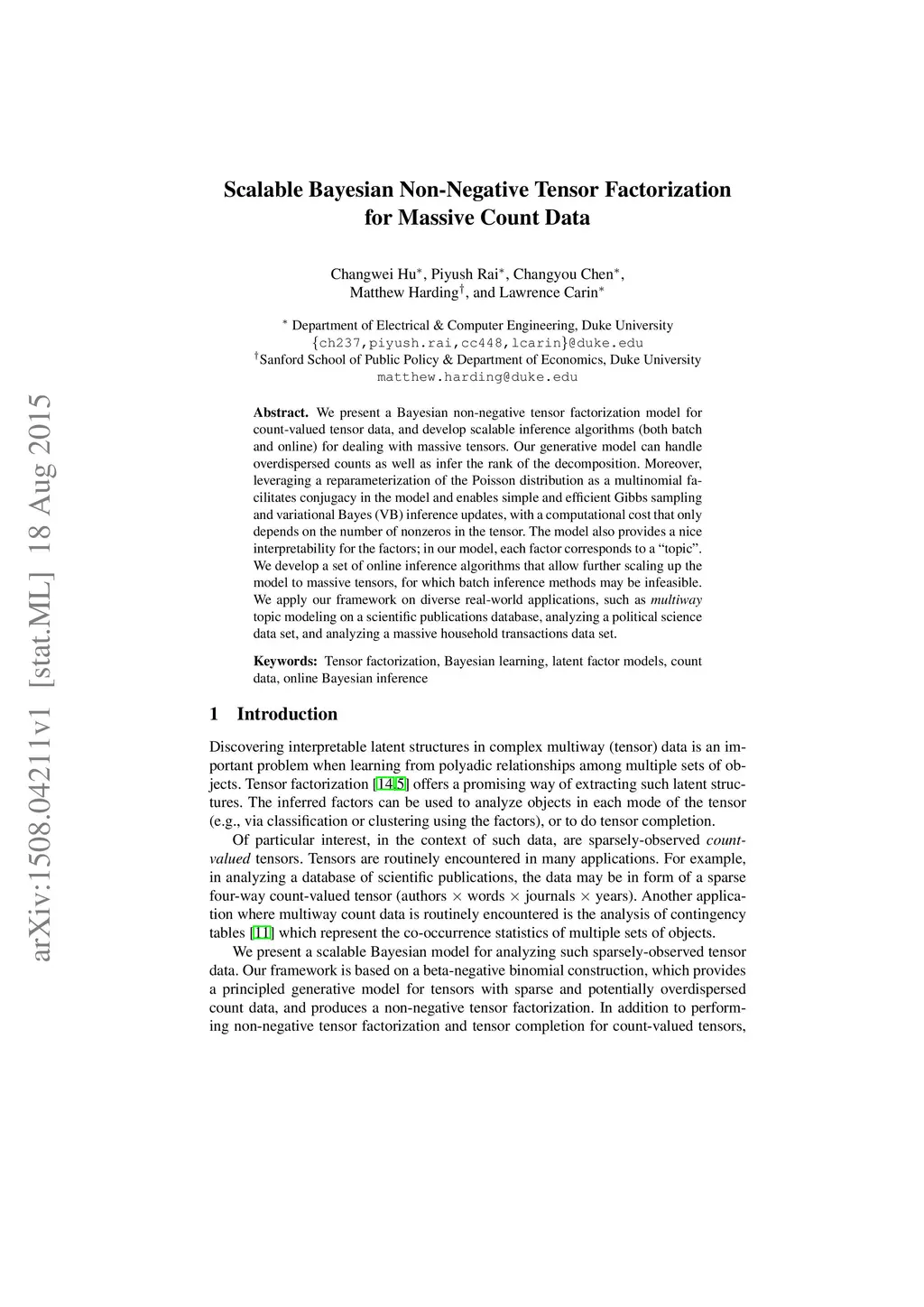 We present a Bayesian non-negative tensor factorization model for count-valued tensor data, and develop scalable inference algorithms (both batch and online) for dealing with massive tensors. Our generative model can handle overdispersed counts as well as infer the rank of the decomposition. Moreover, leveraging a reparameterization of the Poisson distribution as a multinomial facilitates conjugacy in the model and enables simple and efficient Gibbs sampling and variational Bayes (VB) inference updates, with a computational cost that only depends on the number of nonzeros in the tensor. The model also provides a nice interpretability for the factors; in our model, each factor corresponds to a "topic". We develop a set of online inference algorithms that allow further scaling up the model to massive tensors, for which batch inference methods may be infeasible. We apply our framework on diverse real-world applications, such as \emph{multiway} topic modeling on a scientific publications database, analyzing a political science data set, and analyzing a massive household transactions data set.