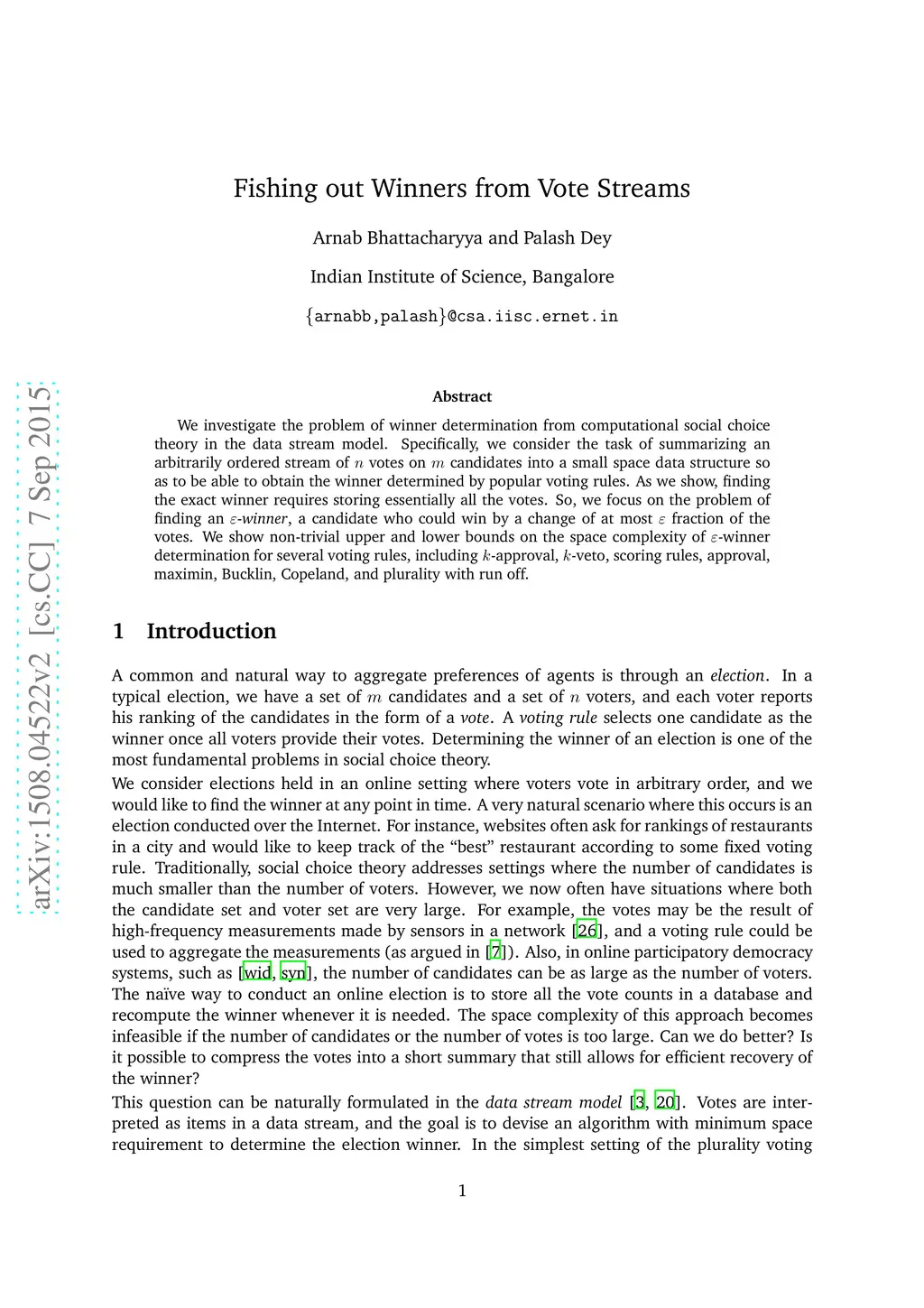 We investigate the problem of winner determination from computational social choice theory in the data stream model. Specifically, we consider the task of summarizing an arbitrarily ordered stream of votes on candidates into a small space data structure so as to be able to obtain the winner determined by popular voting rules. As we show, finding the exact winner requires storing essentially all the votes. So, we focus on the problem of finding an {\em -winner}, a candidate who could win by a change of at most fraction of the votes. We show non-trivial upper and lower bounds on the space complexity of -winner determination for several voting rules, including -approval, -veto, scoring rules, approval, maximin, Bucklin, Copeland, and plurality with run off.