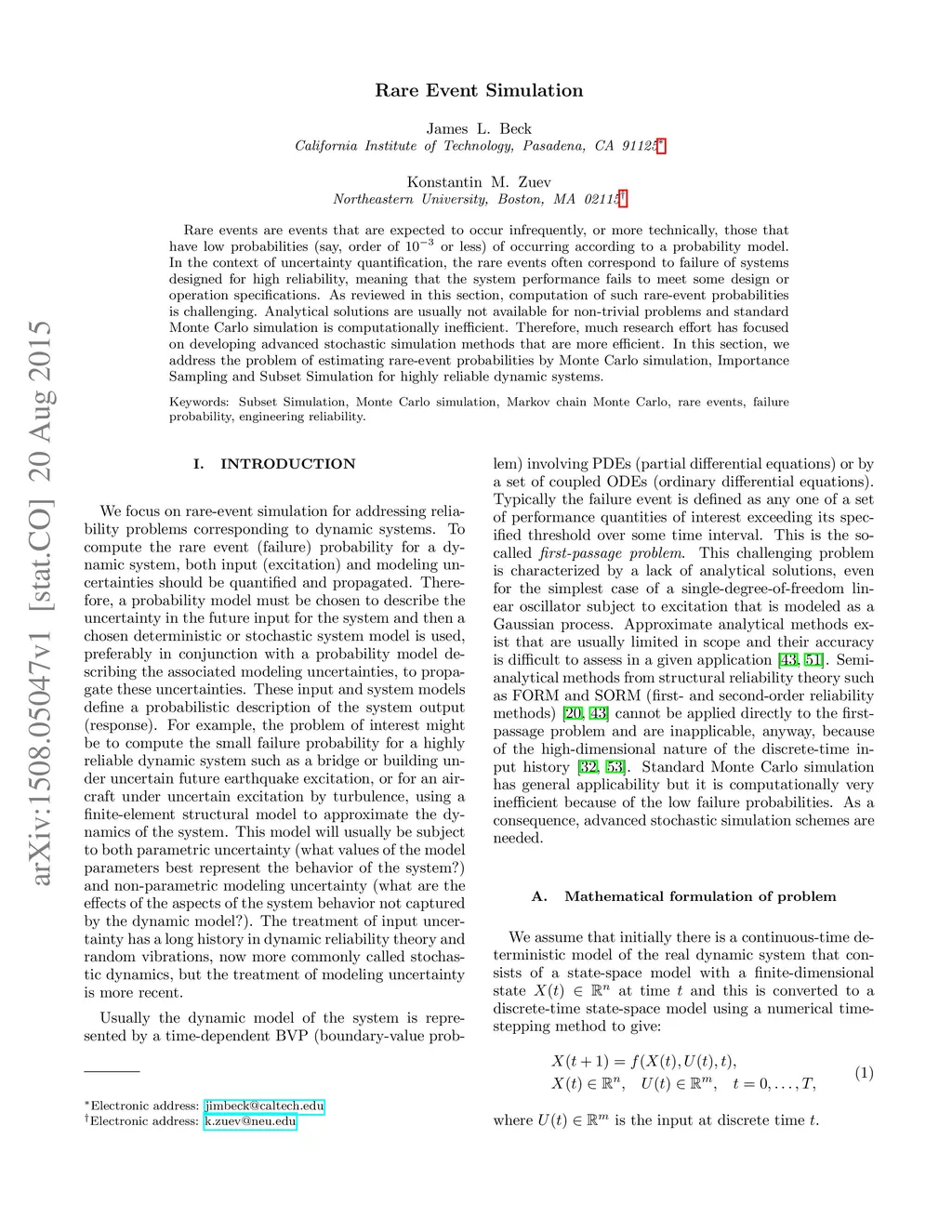 Rare events are events that are expected to occur infrequently, or more technically, those that have low probabilities (say, order of or less) of occurring according to a probability model. In the context of uncertainty quantification, the rare events often correspond to failure of systems designed for high reliability, meaning that the system performance fails to meet some design or operation specifications. As reviewed in this section, computation of such rare-event probabilities is challenging. Analytical solutions are usually not available for non-trivial problems and standard Monte Carlo simulation is computationally inefficient. Therefore, much research effort has focused on developing advanced stochastic simulation methods that are more efficient. In this section, we address the problem of estimating rare-event probabilities by Monte Carlo simulation, Importance Sampling and Subset Simulation for highly reliable dynamic systems.