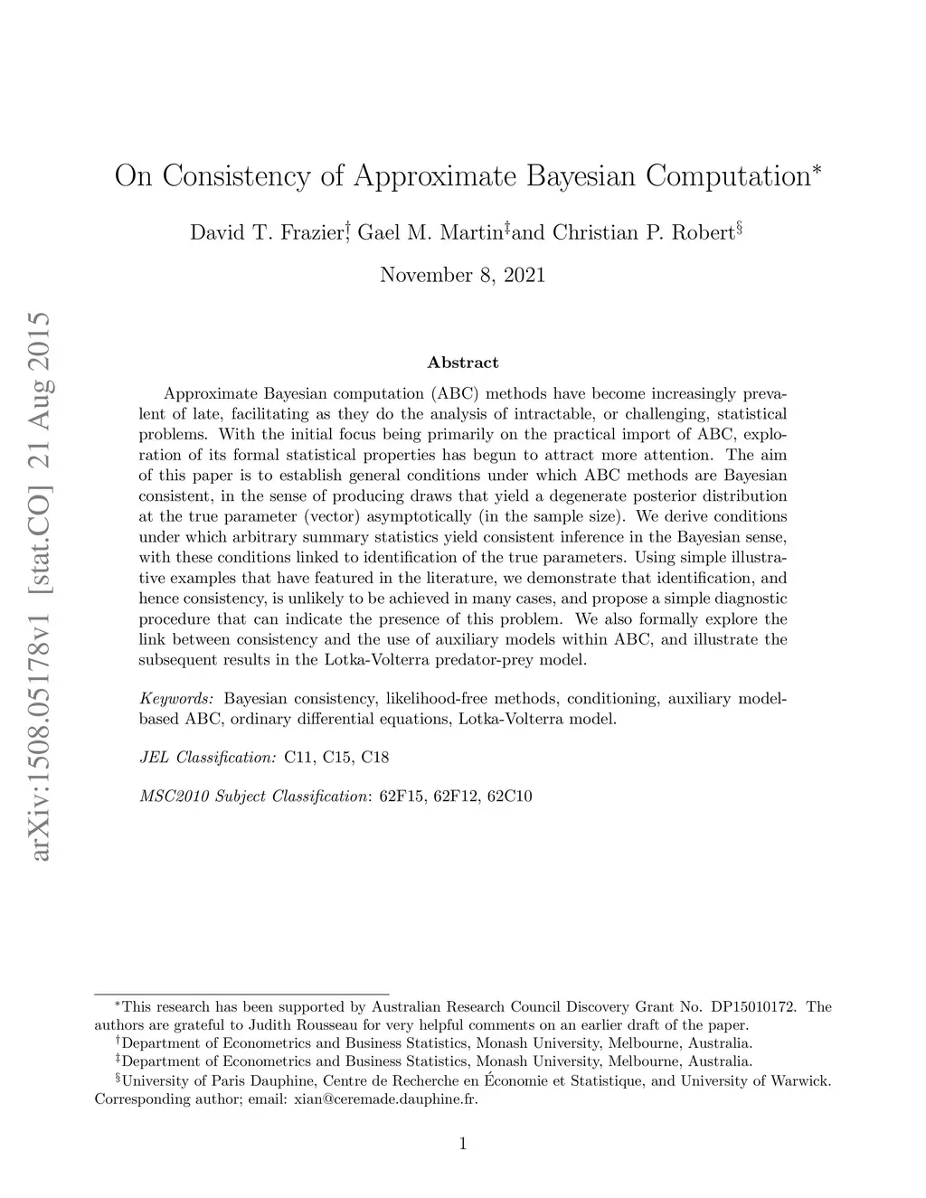 Approximate Bayesian computation (ABC) methods have become increasingly prevalent of late, facilitating as they do the analysis of intractable, or challenging, statistical problems. With the initial focus being primarily on the practical import of ABC, exploration of its formal statistical properties has begun to attract more attention. The aim of this paper is to establish general conditions under which ABC methods are Bayesian consistent, in the sense of producing draws that yield a degenerate posterior distribution at the true parameter (vector) asymptotically (in the sample size). We derive conditions under which arbitrary summary statistics yield consistent inference in the Bayesian sense, with these conditions linked to identification of the true parameters. Using simple illustrative examples that have featured in the literature, we demonstrate that identification, and hence consistency, is unlikely to be achieved in many cases, and propose a simple diagnostic procedure that can indicate the presence of this problem. We also formally explore the link between consistency and the use of auxiliary models within ABC, and illustrate the subsequent results in the Lotka-Volterra predator-prey model.