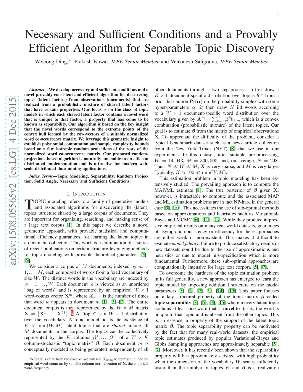 We develop necessary and sufficient conditions and a novel provably consistent and efficient algorithm for discovering topics (latent factors) from observations (documents) that are realized from a probabilistic mixture of shared latent factors that have certain properties. Our focus is on the class of topic models in which each shared latent factor contains a novel word that is unique to that factor, a property that has come to be known as separability. Our algorithm is based on the key insight that the novel words correspond to the extreme points of the convex hull formed by the row-vectors of a suitably normalized word co-occurrence matrix. We leverage this geometric insight to establish polynomial computation and sample complexity bounds based on a few isotropic random projections of the rows of the normalized word co-occurrence matrix. Our proposed random-projections-based algorithm is naturally amenable to an efficient distributed implementation and is attractive for modern web-scale distributed data mining applications.