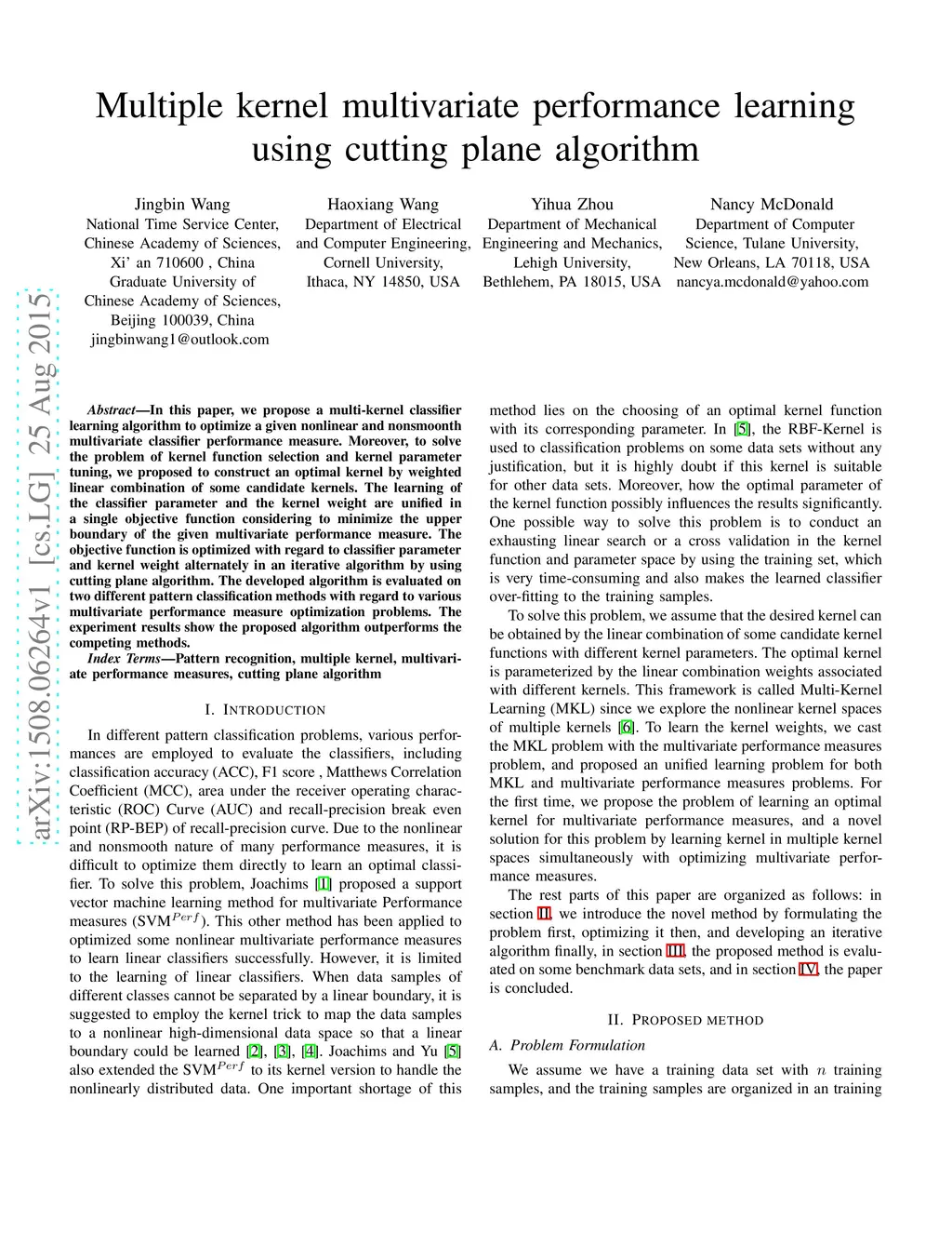 Multiple kernel multivariate performance learning using cutting plane