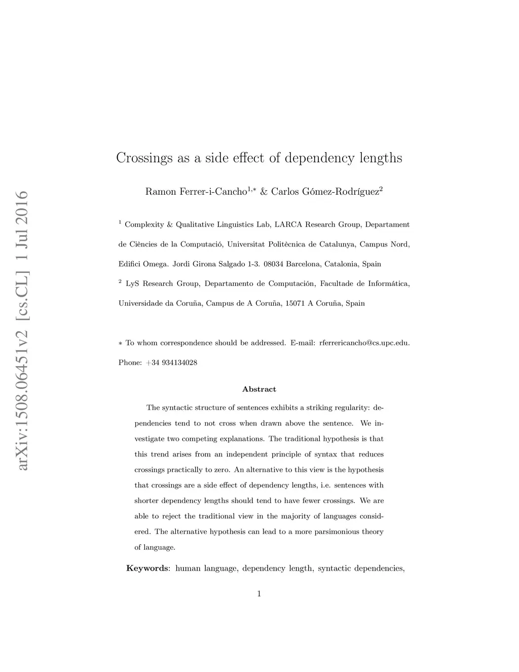 The syntactic structure of sentences exhibits a striking regularity: dependencies tend to not cross when drawn above the sentence. We investigate two competing explanations. The traditional hypothesis is that this trend arises from an independent principle of syntax that reduces crossings practically to zero. An alternative to this view is the hypothesis that crossings are a side effect of dependency lengths, i.e. sentences with shorter dependency lengths should tend to have fewer crossings. We are able to reject the traditional view in the majority of languages considered. The alternative hypothesis can lead to a more parsimonious theory of language.